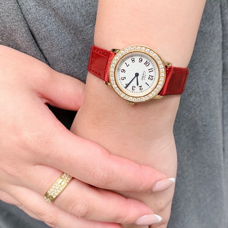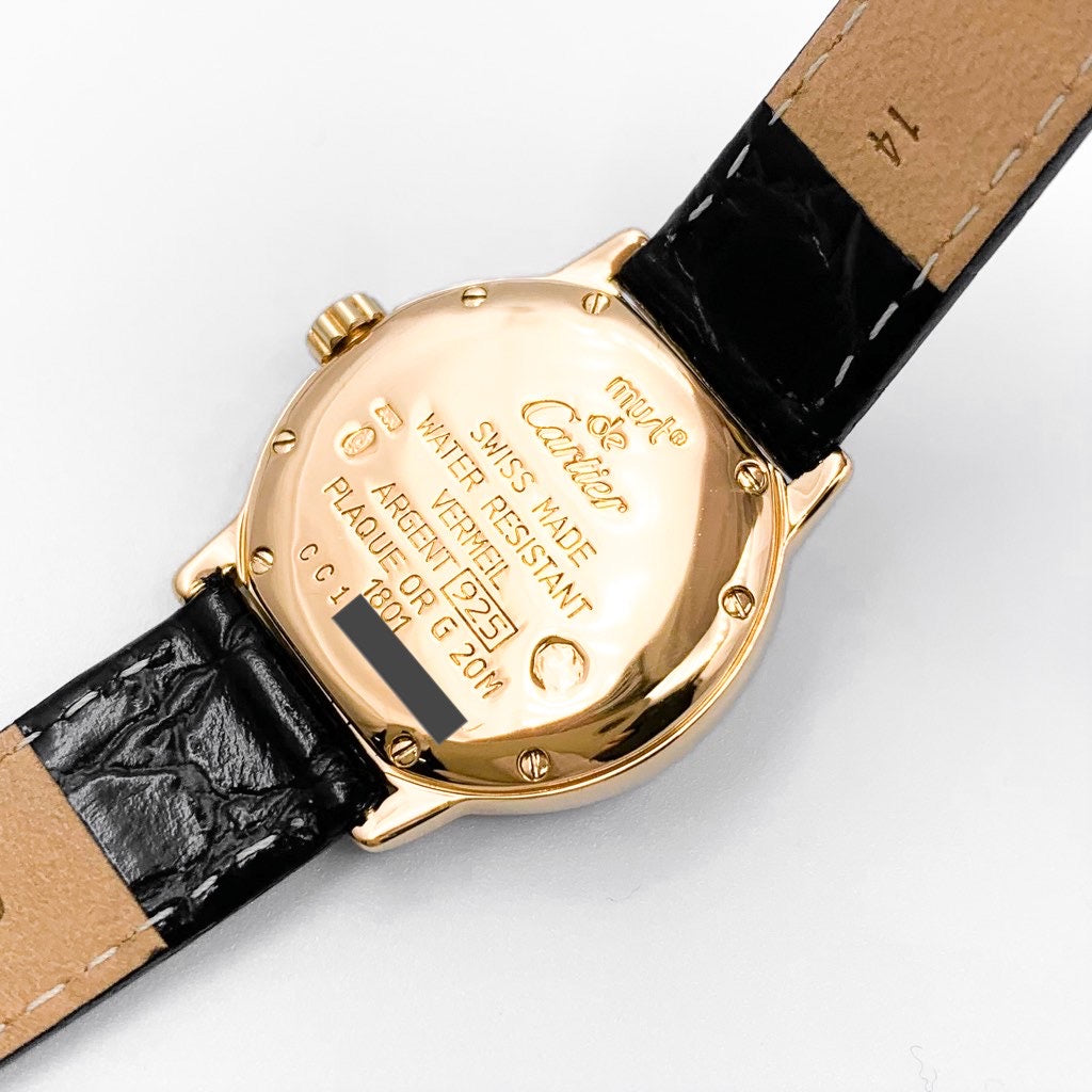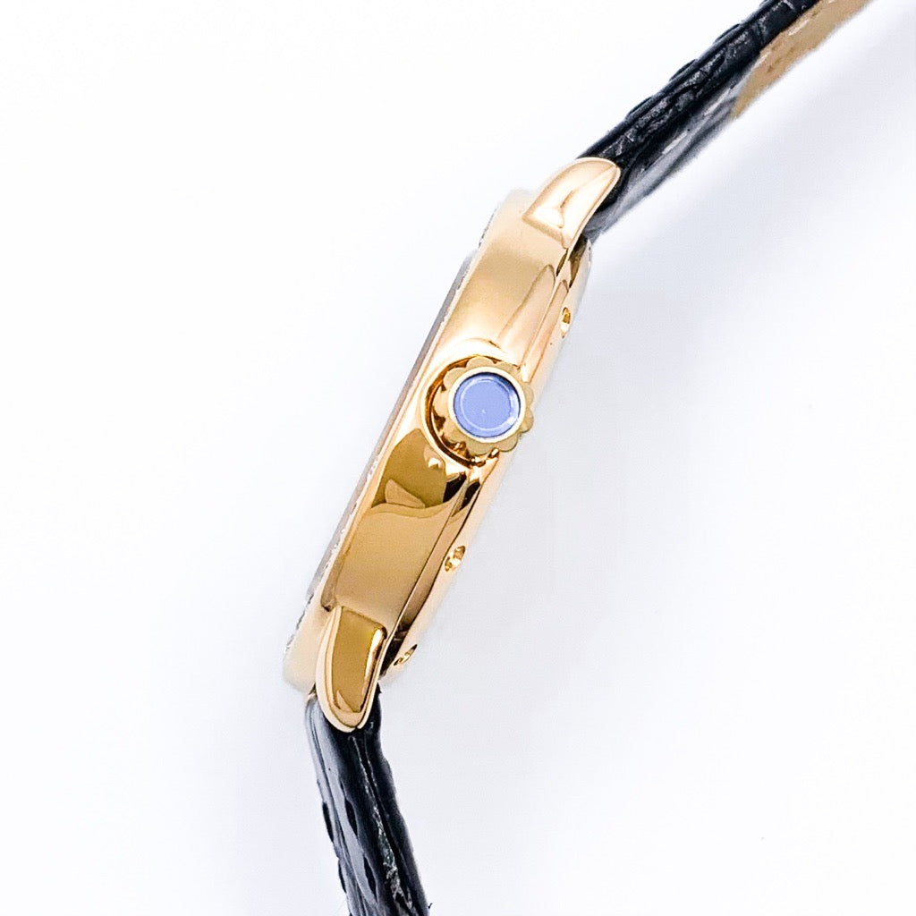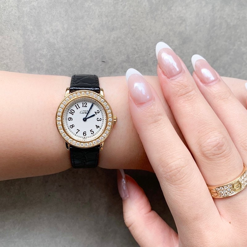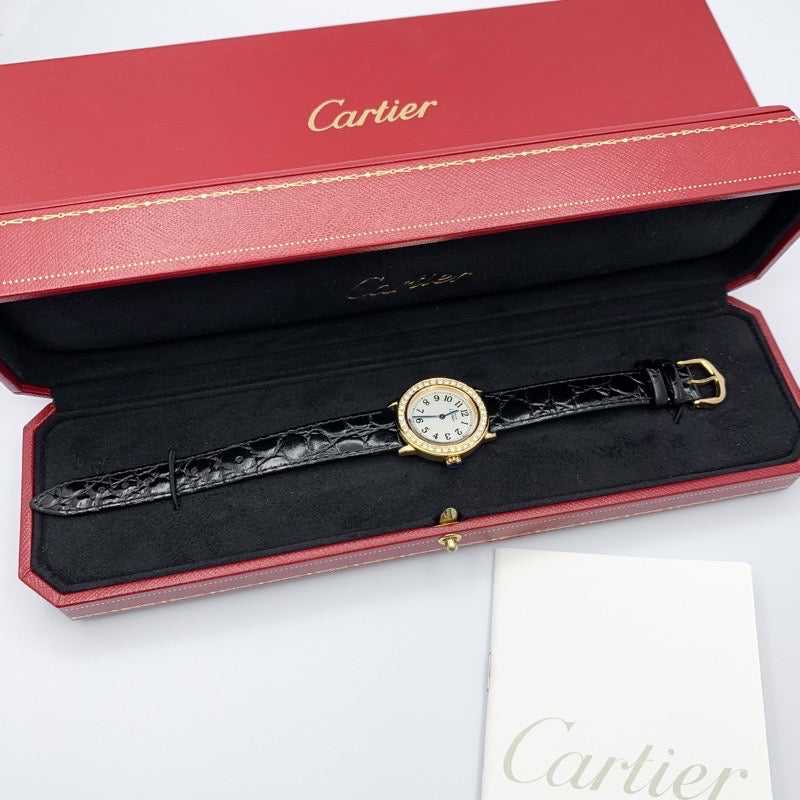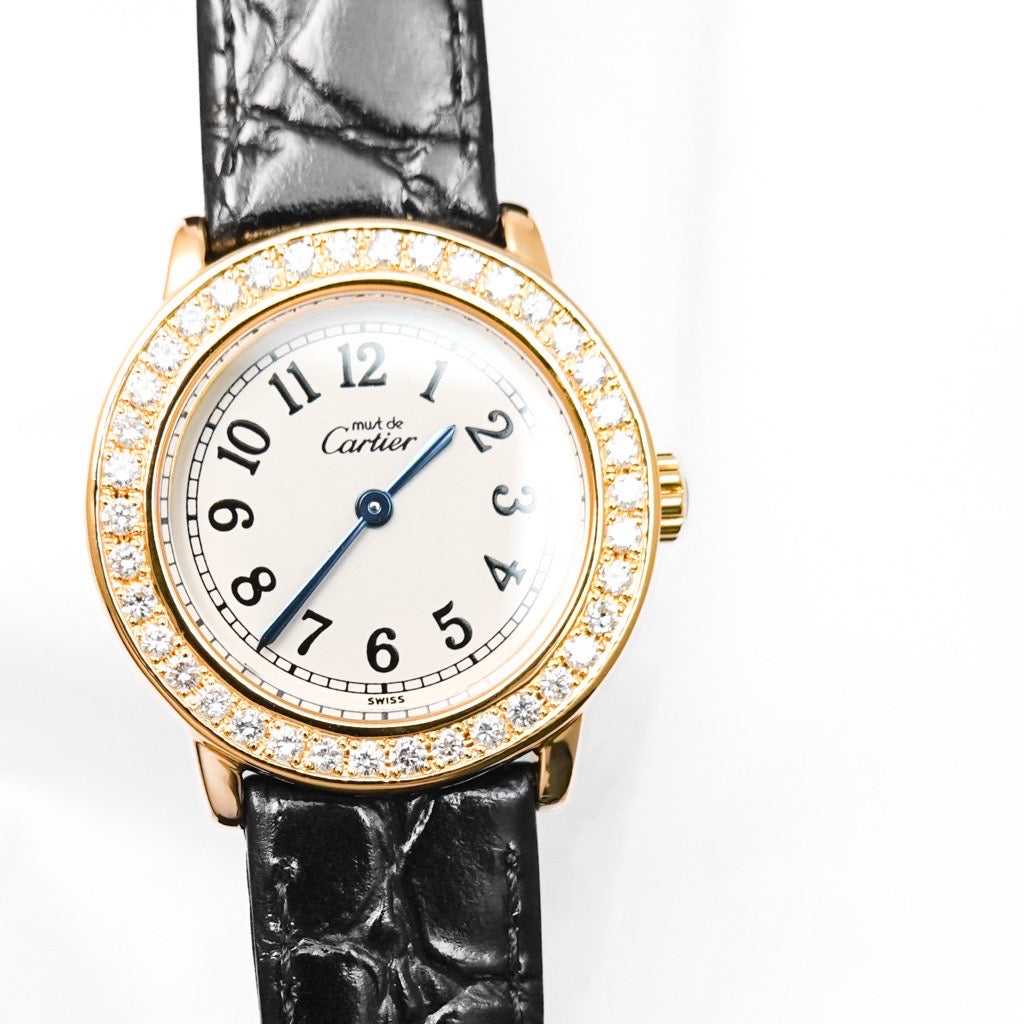 Cartier's simple watch "Ronde" can be used in a variety of situations This watch has a cute and mature style with an Arabic numeral dial and luxurious diamonds embedded in the entire bezel, which is rare for Cartier, which often uses Roman dials. The battery has been replaced, inspected, and the exterior has been finished by our craftsmen and first-class watch repair technicians, so you can use it with peace of mind.