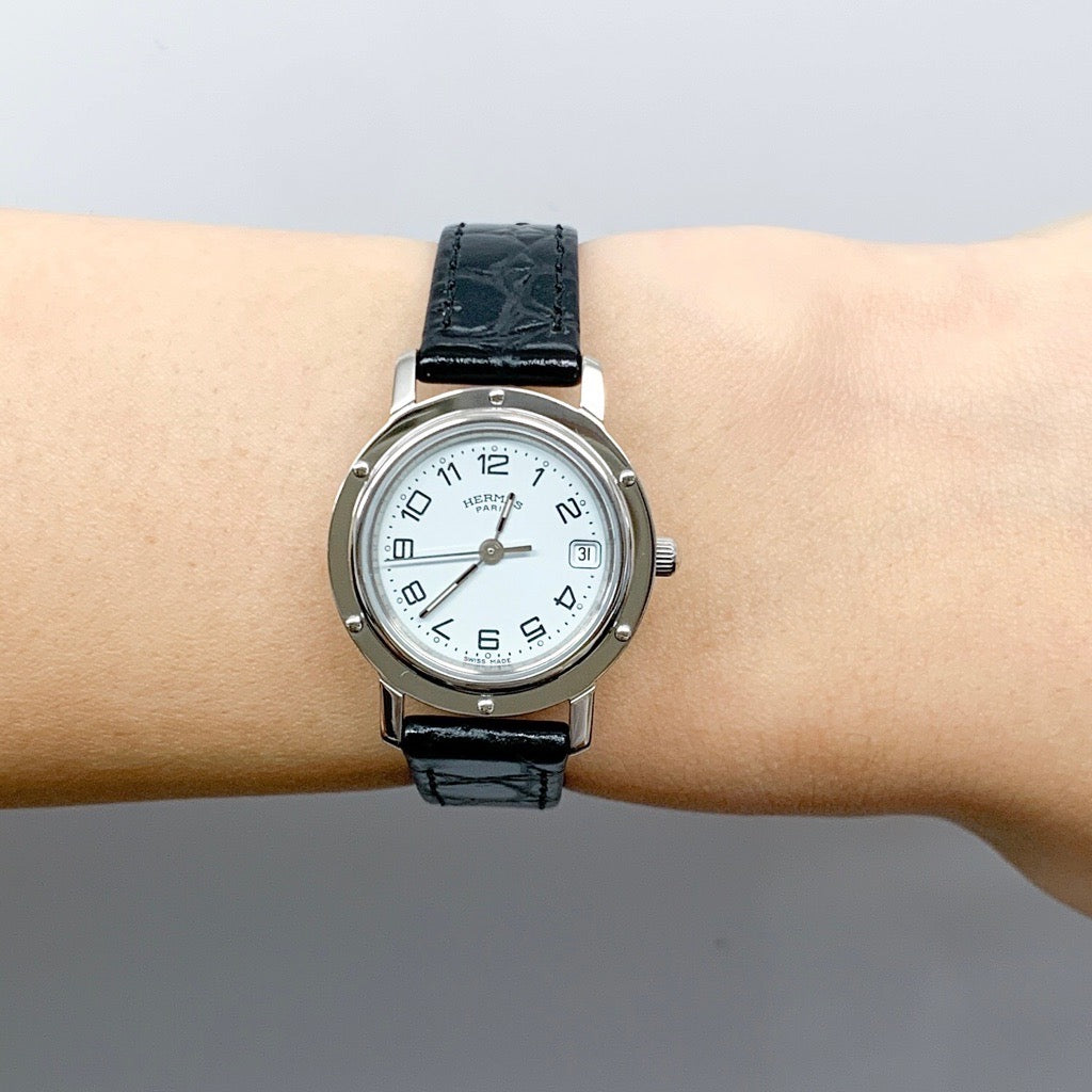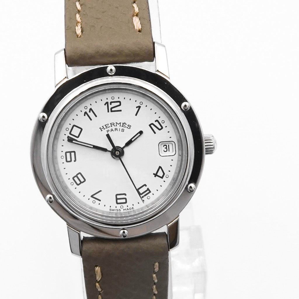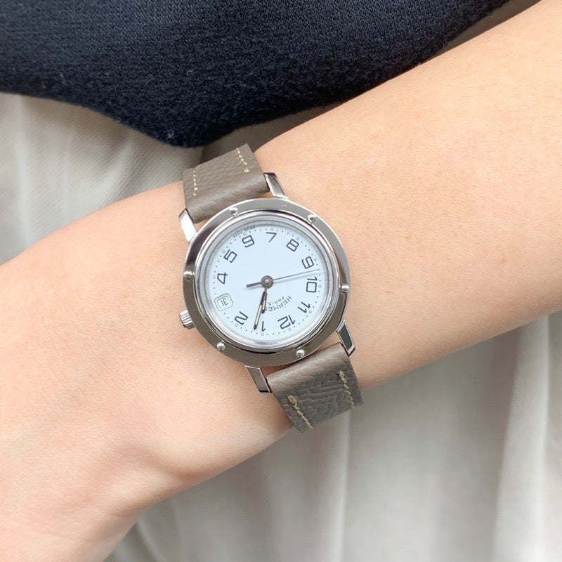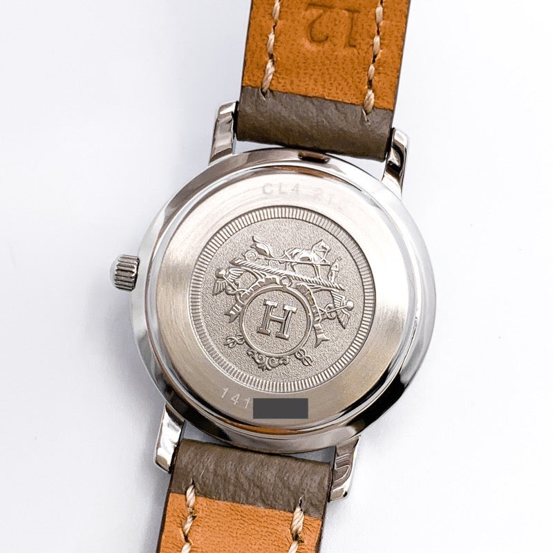 世代を超えて愛されるHERMES。 シンプルながらもデザイン性の高いベゼルが、お洒落心を満たし、憧れのHERMESがあなたの腕元を彩る逸品。 当店職人、一級時計修理技能士による電池交換、点検、外装仕上済みで安心してご愛用いただけます。