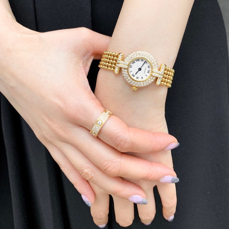 The three-dimensional double lines of the beautiful "Corizée" Made of 18K yellow gold and lavishly decorated with genuine diamonds, this jewelry watch is perfect for mature women. This delicate bracelet creates a luxurious atmosphere and is a rare item that is difficult to obtain as it is hardly ever distributed. You can wear it in a variety of situations by combining it with a beautifully lustrous leather strap. You can use it with peace of mind as it has been overhauled, inspected, and finished by a first-class watch repair technician.