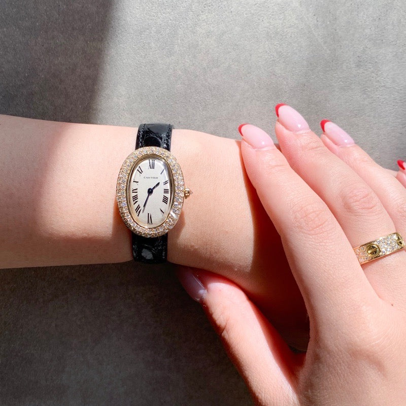 The elegant beauty of the Baignoire is only available in K18 material, giving you a sense of luxury for adults. The sparkle of the diamonds on the bezel creates a glamorous feminine look. The strap comes in two new colors, so you can enjoy it according to your mood. You can use it with peace of mind as it comes with a complete Cartier service.