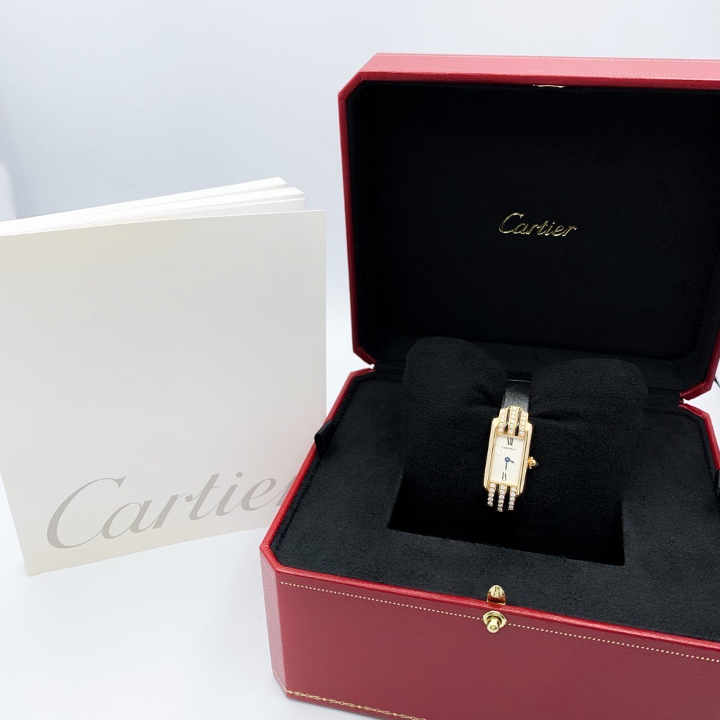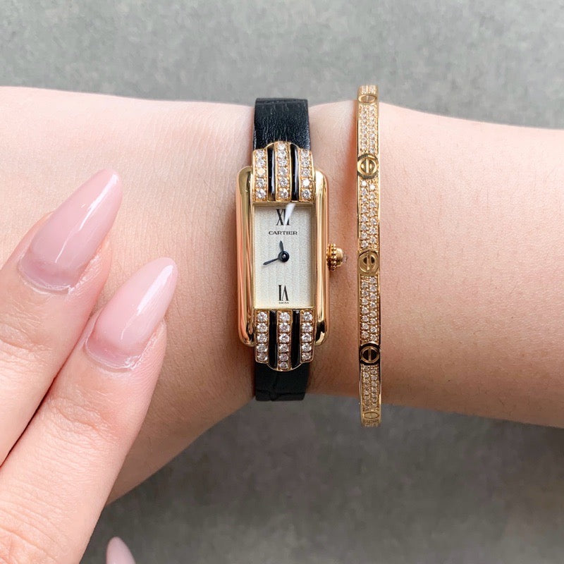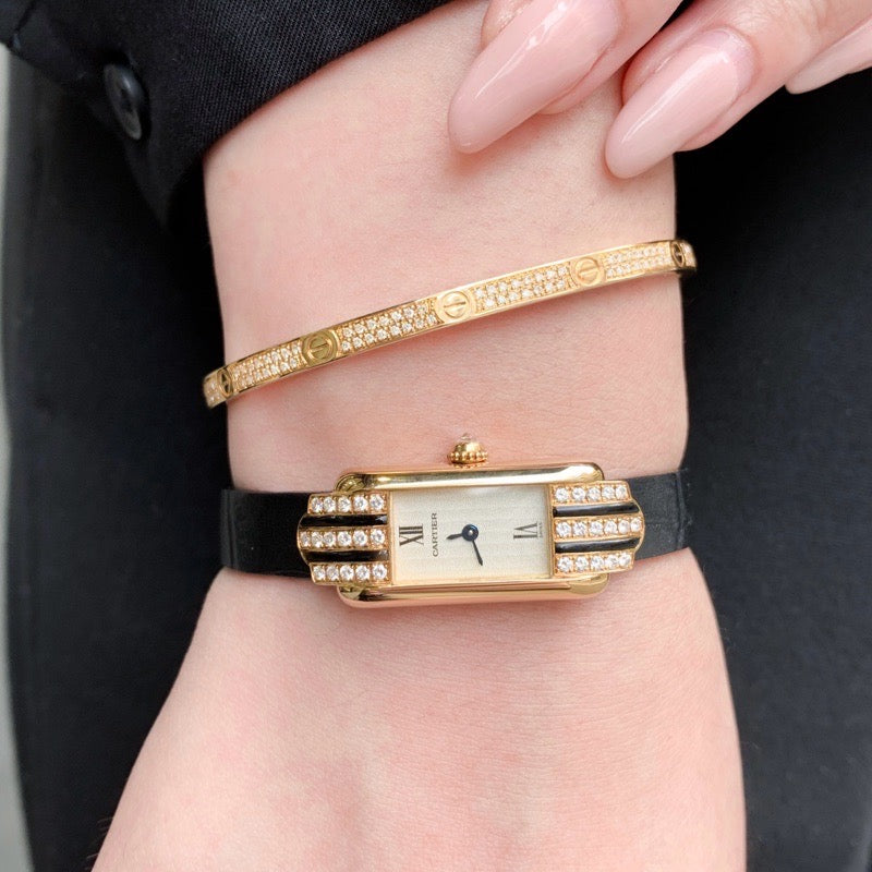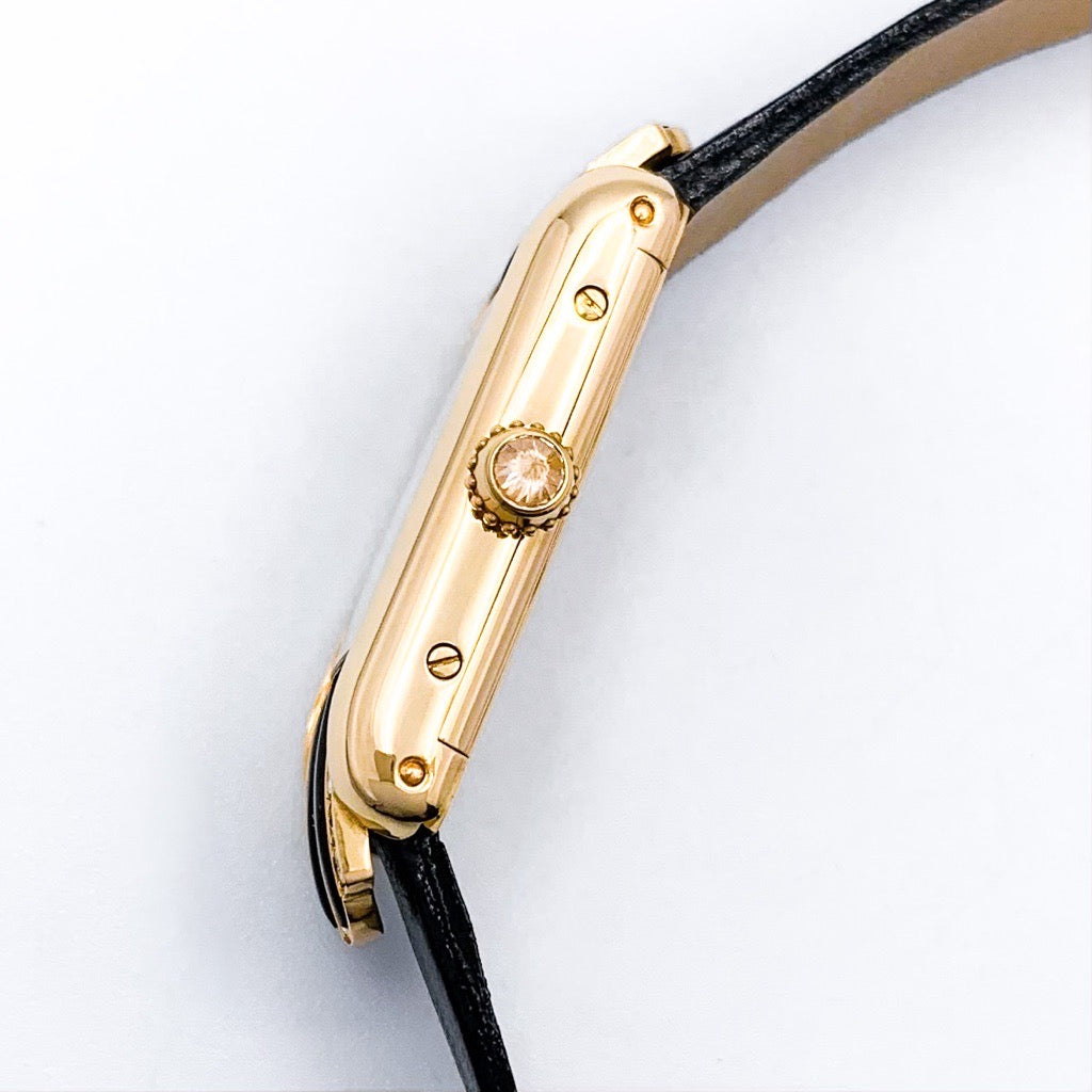 Cartier's Tank series was born in 1917. Among them, the Tank Alongée has a sharper impression. The case has an original shape and is based on yellow gold, decorated with oak and diamonds, making it a captivating item with an elegant and delicate size and graceful appearance. A rare gem that is difficult to obtain. The battery has been replaced, inspected, and the exterior has been finished by our craftsmen and first-class watch repair technicians, so you can use it with peace of mind.