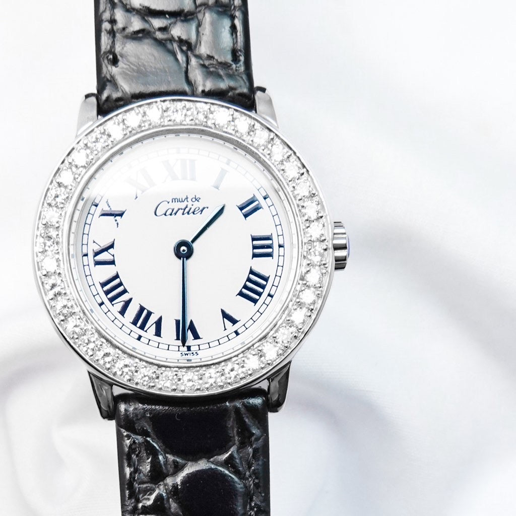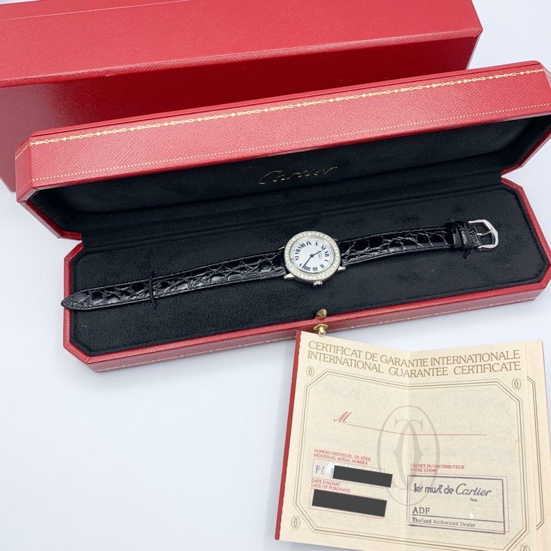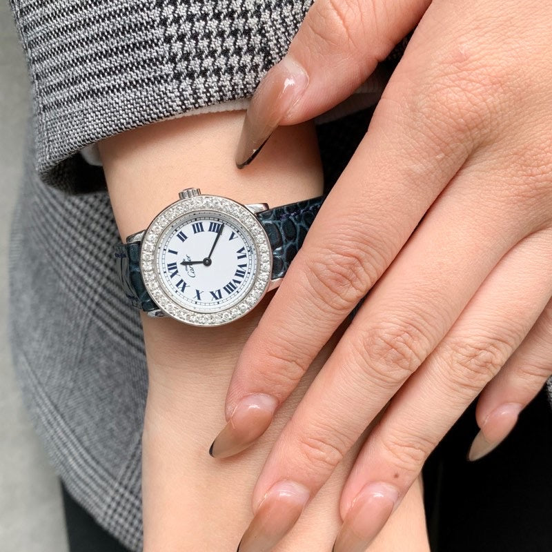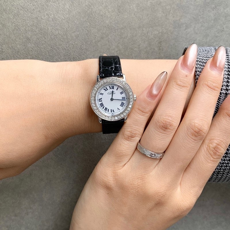 Cartier's simple Ronde watch embodies classic elegance. The bezel is adorned with luxurious diamonds, gracefully adorning the wrist. This luxurious piece comes with an authentic Cartier buckle and two straps. It comes with a Cartier warranty, a battery replacement by a first-class watch repair technician, and exterior refinishing, ensuring peace of mind.