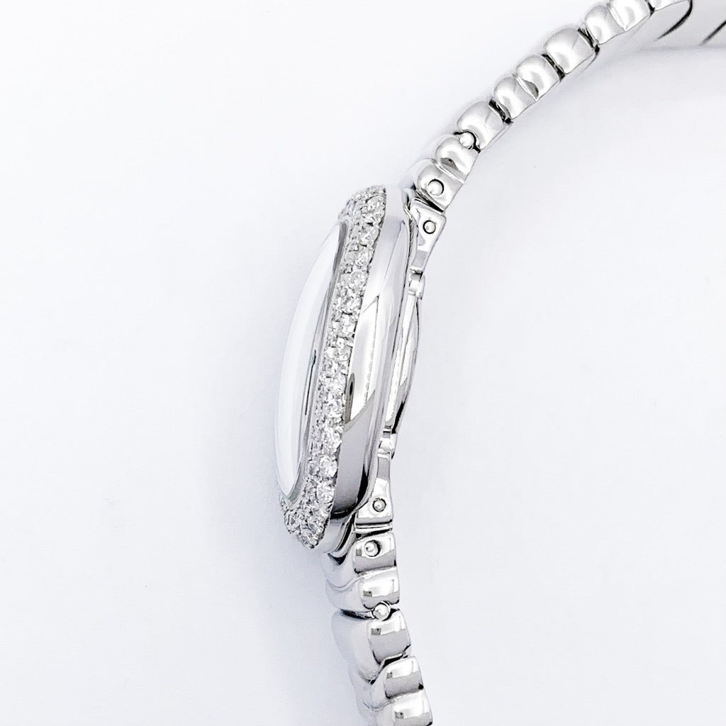 The elegant oval shape of the Baignoire, with its unique lines, is a supple bracelet made of 18K white gold and set with diamonds, adding a touch of luxury to any sophisticated wrist. It comes with a Cartier repair certificate, and has been inspected and replaced with a new battery by Cartier, so you can enjoy it with peace of mind.