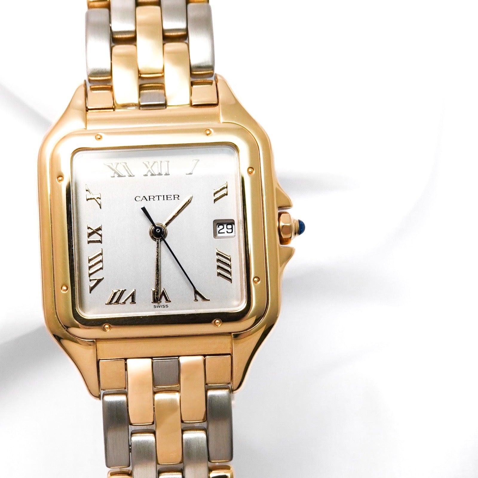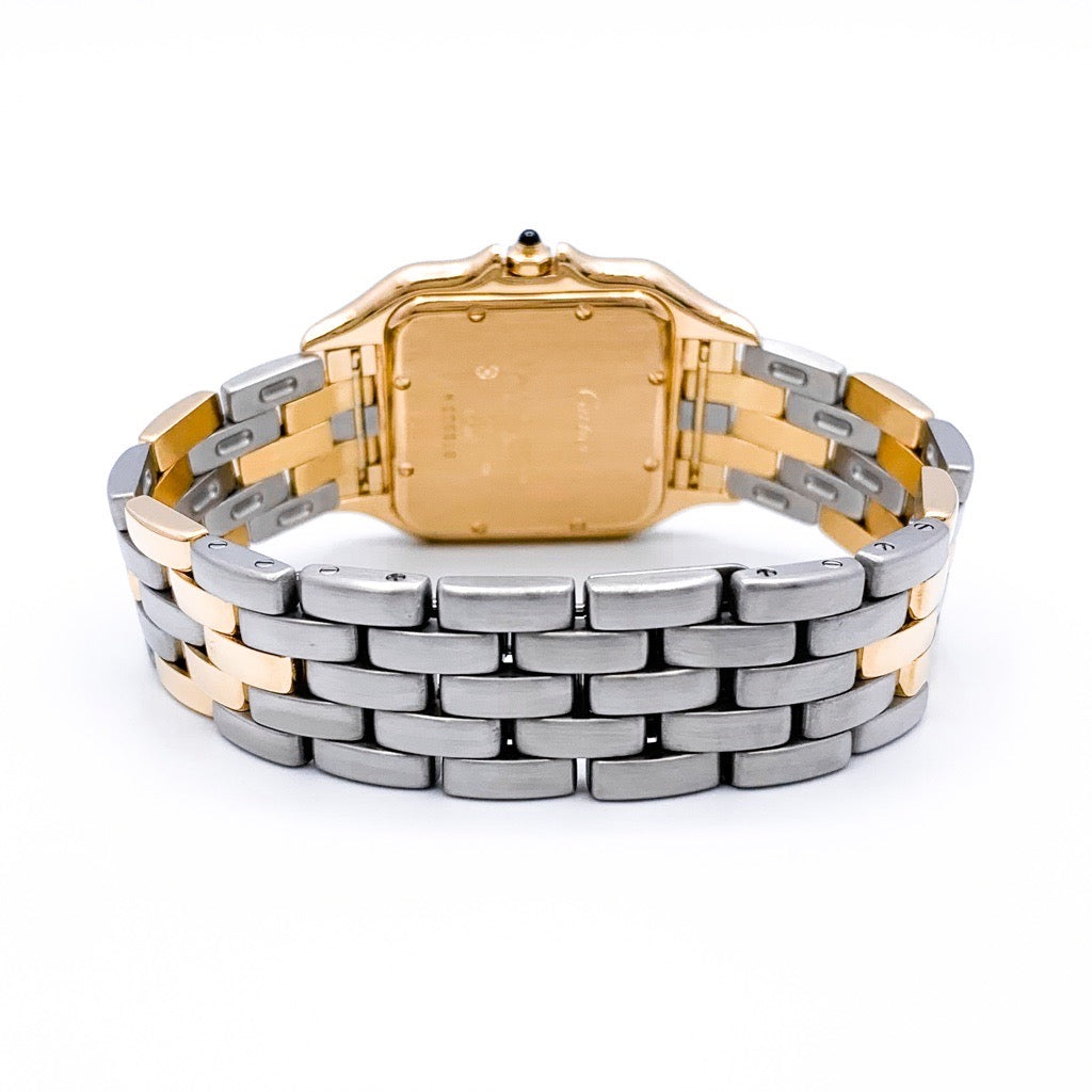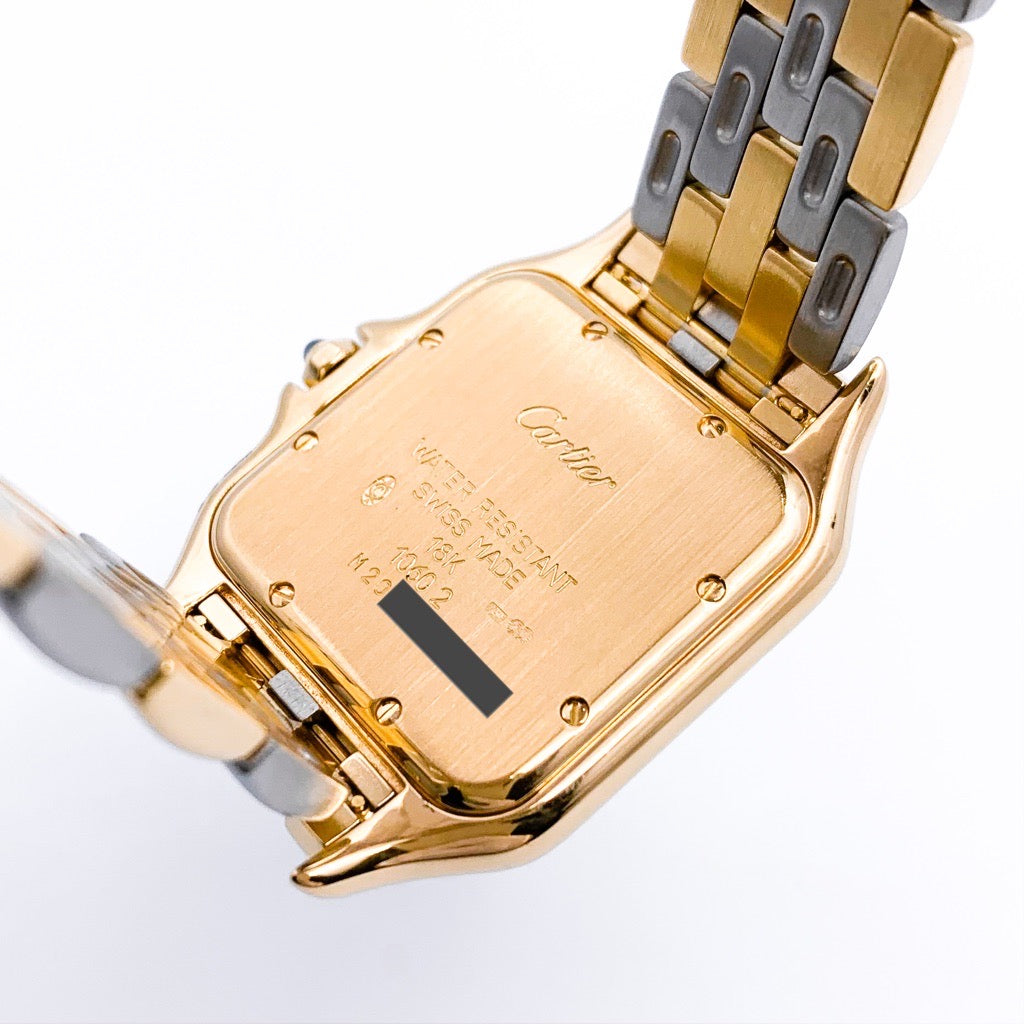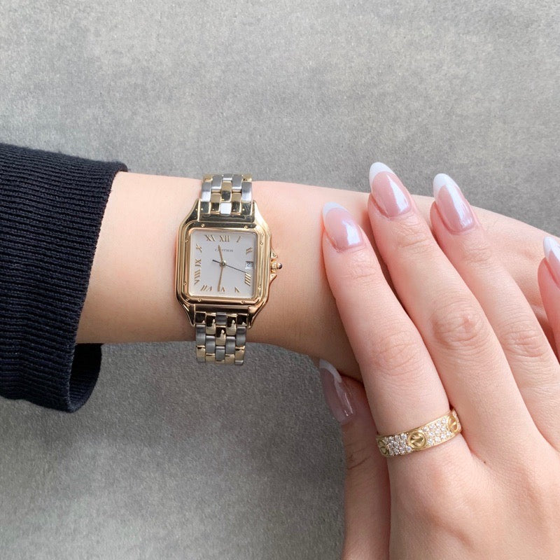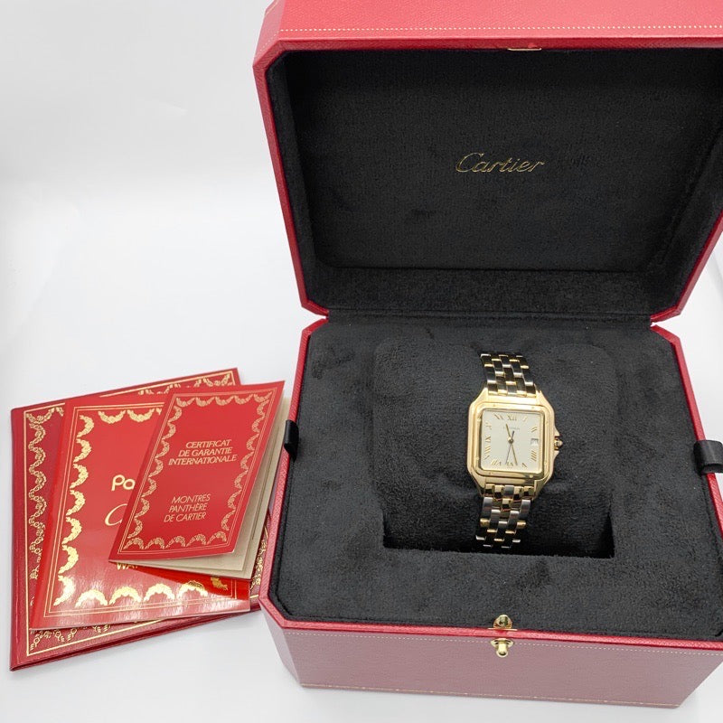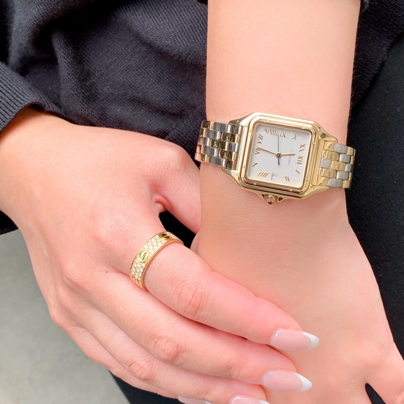 Since its launch in 1983, the Panther has been immovably popular. The grey dial and gold-colored Roman numerals and hands give it a luxurious look. The combination of colors makes it easy to match with any jewelry and will add a touch of glamour to your wrist. The LM size is a popular size for both men and women, and is a watch that you can wear for a lifetime and love for any occasion. It comes with a Cartier warranty (blank) and has been overhauled, inspected, and finished by our first-class watch repair technician, so you can use it with peace of mind.