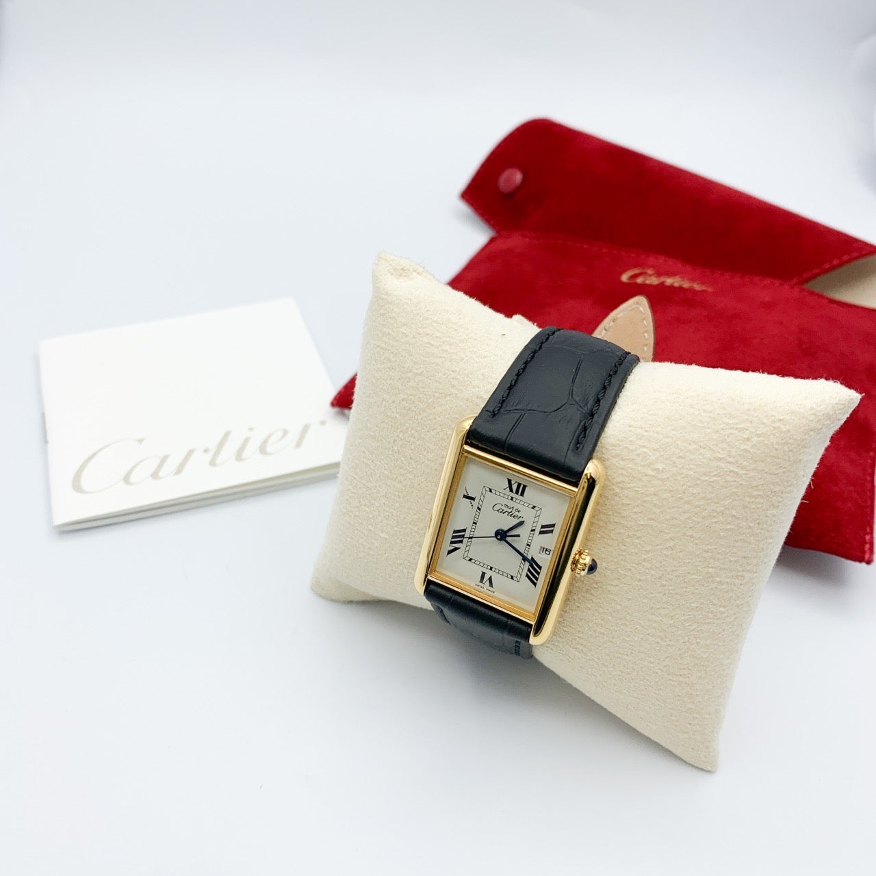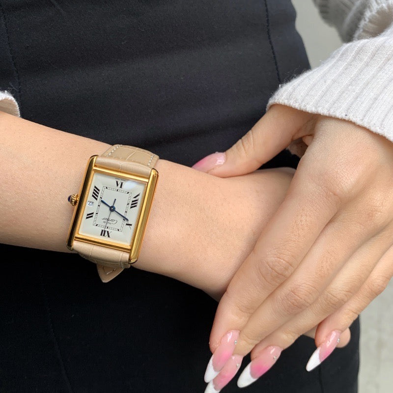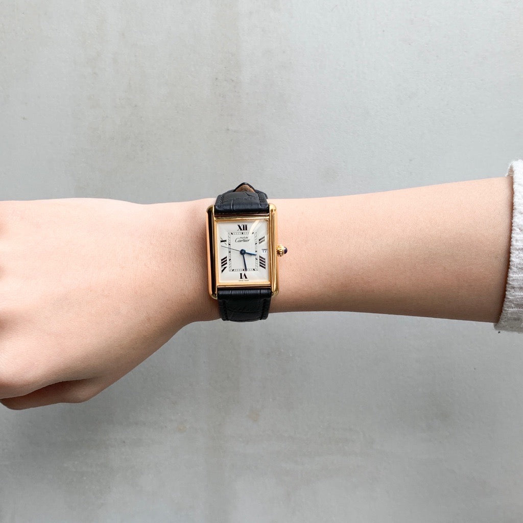 The Tank, which has been popular for over 100 years since its birth, features a square case and a minimalist decoration, allowing for an elegant look in any situation. The Must Tank 3-hand date model is now very hard to come by, and is a must-have for Cartier enthusiasts. The face is 25mm and unisex. It has been overhauled, inspected, and finished by our craftsmen and first-class watch repair technicians, so you can use it with confidence.