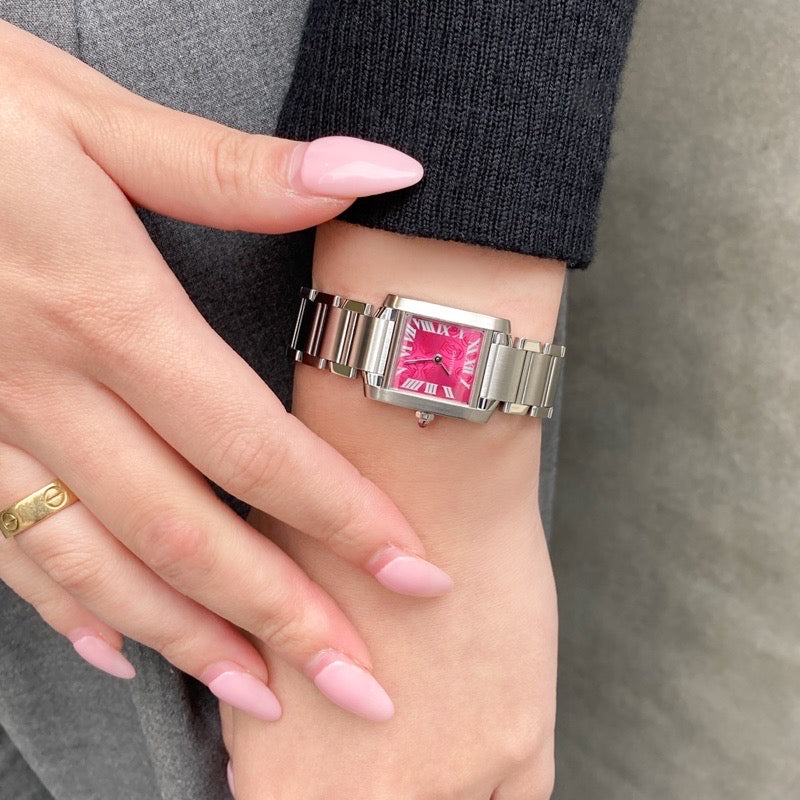 The Tank Française, one of the most popular watches in the CARTIER series, has a raspberry dial, a rare model that was only available for a limited time. It is no longer in production, but the gorgeous presence of the dial combined with diamonds makes it a unique piece. The battery has been replaced, inspected, and the exterior has been finished by our craftsmen and first-class watch repair technicians, so you can use it with peace of mind.