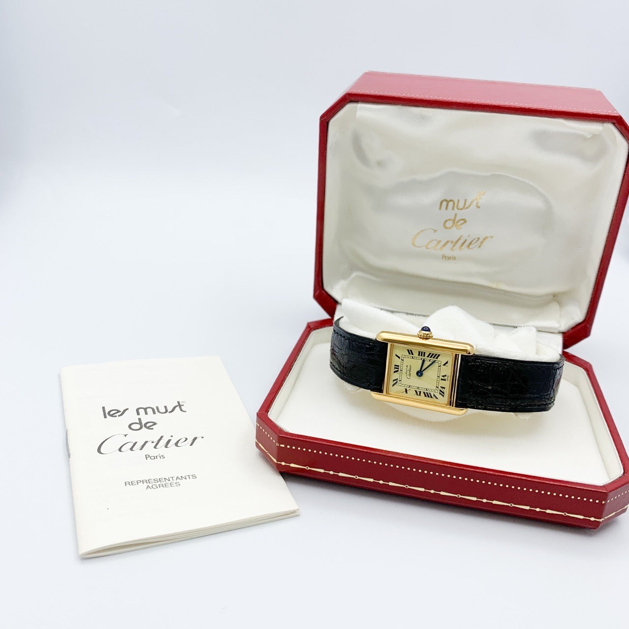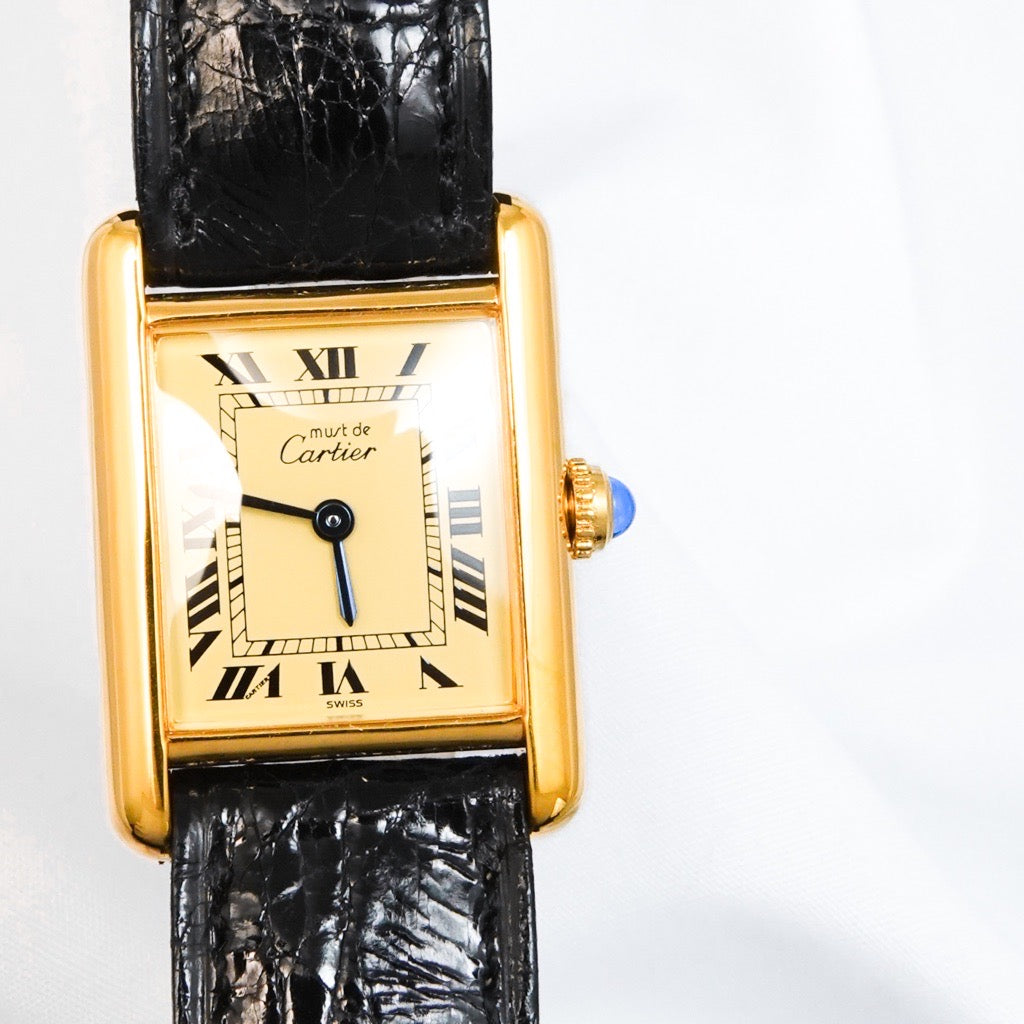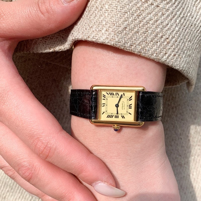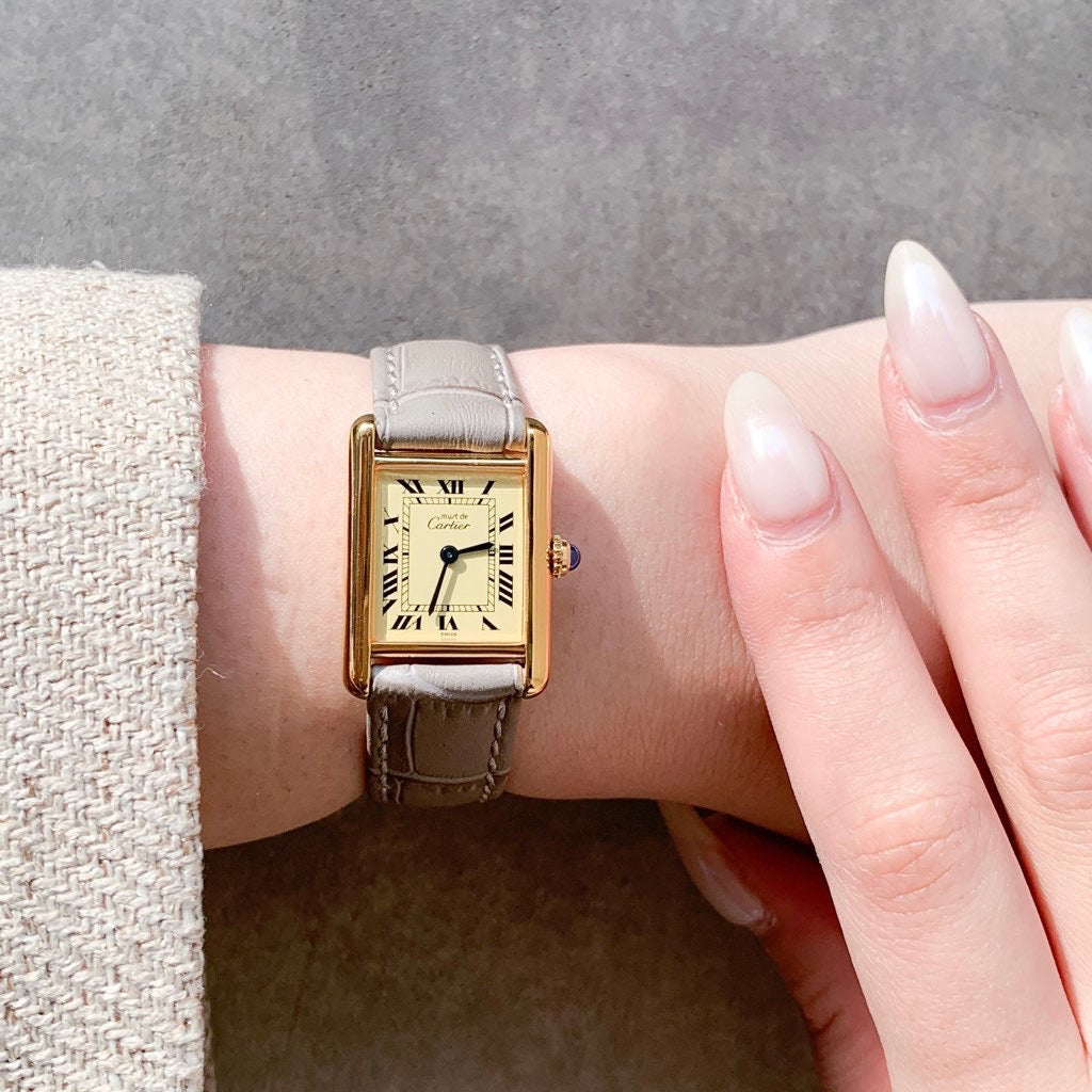 The Tank, which has been popular for over 100 years since its birth, features a square case and a classic design with no unnecessary decoration, allowing for an elegant look in any situation, from formal to casual. The watch has been overhauled, inspected, and finished by our craftsmen and first-class watch repair technicians, so you can use it with confidence.