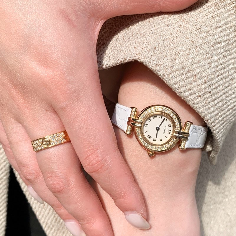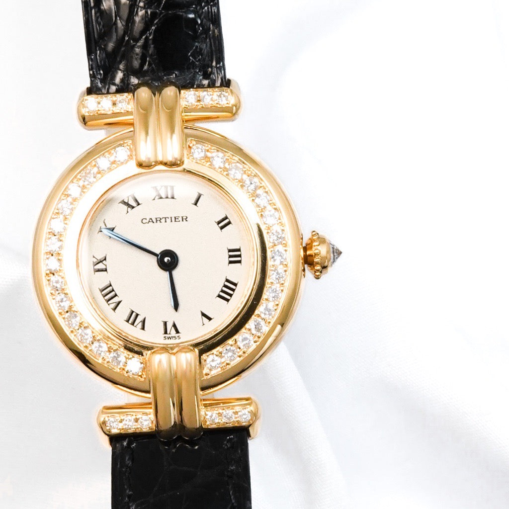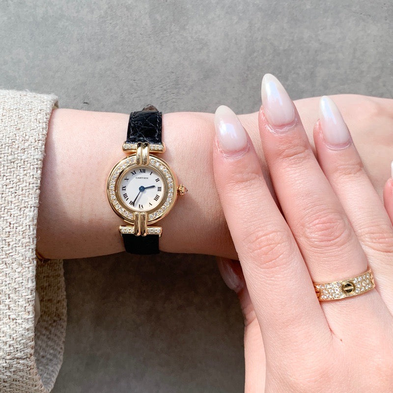 The three-dimensionally designed double line of the "Corise" is beautiful, and the simple Roman dial and rounded feminine bezel make this a jewelry watch suitable for mature women. The sparkle of K18YG and diamonds gives it an even more elegant and luxurious impression. Complete Cartier service and Cartier warranty included.