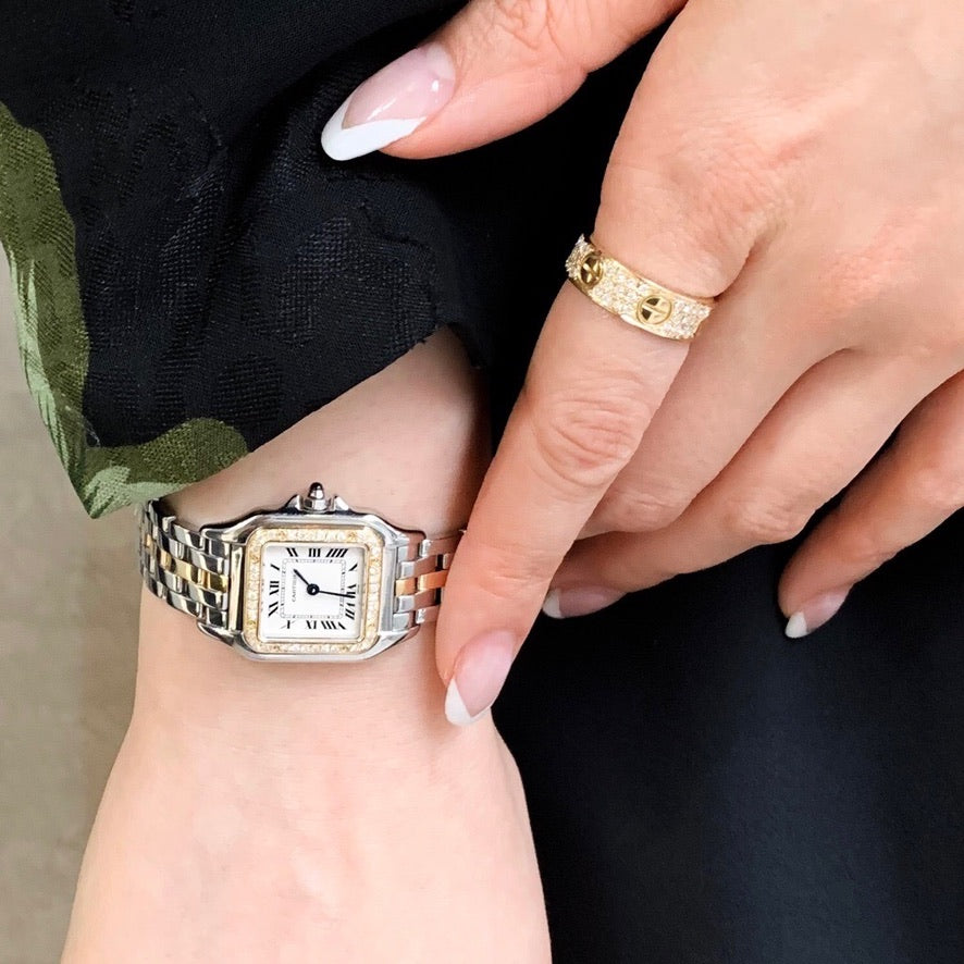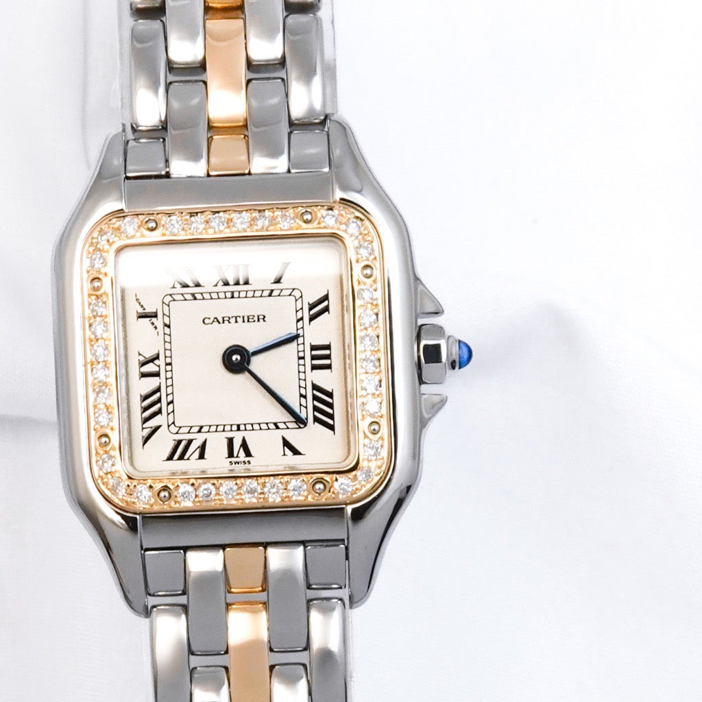 Since its launch in 1983, the Panthère de Cartier has been immovably popular. The diamonds on the bezel are simple and subtle, creating an elegant look that is perfect for everyday wear. The one-row model, with its combination color that can be easily matched with any jewelry and will last a long time, will add a touch of glamour to your wrist. The battery has been replaced, inspected, and the exterior has been finished by our craftsmen and first-class watch repair technicians, so you can use it with peace of mind.