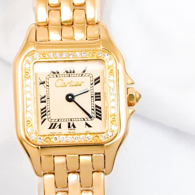 The iconic Panthère de Cartier watch, crafted from 18K yellow gold and featuring diamonds on the bezel, adds a unique and elegant touch to any wrist. While most 18K gold models are available in mini sizes, this SM size is rare. The dial, featuring a three-dimensional logo design, is a truly eye-catching masterpiece. It has been overhauled, inspected, and refinished by a first-class watch repair technician, so you can enjoy it with peace of mind.*