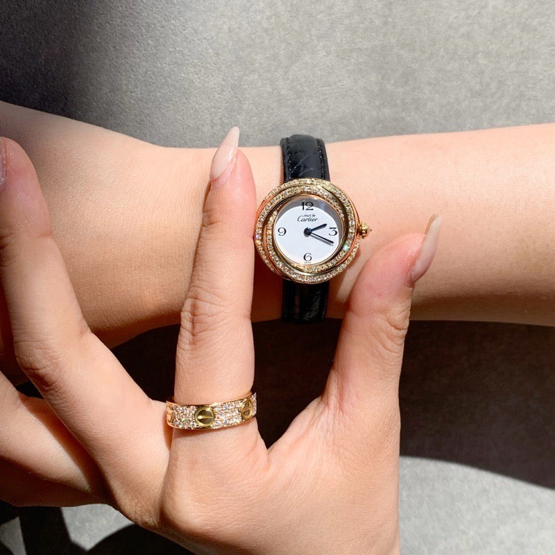 This watch collection was created in 1997 and incorporates the symbolic design of Cartier's iconic jewelry, the Trinity. The three-ring spiral creates a beautiful three-dimensional structure, and the diamonds on the bezel give off an elegant shine. The watch has been inspected, inspected, and finished by our craftsmen and first-class watch repair technicians, so you can use it with peace of mind.