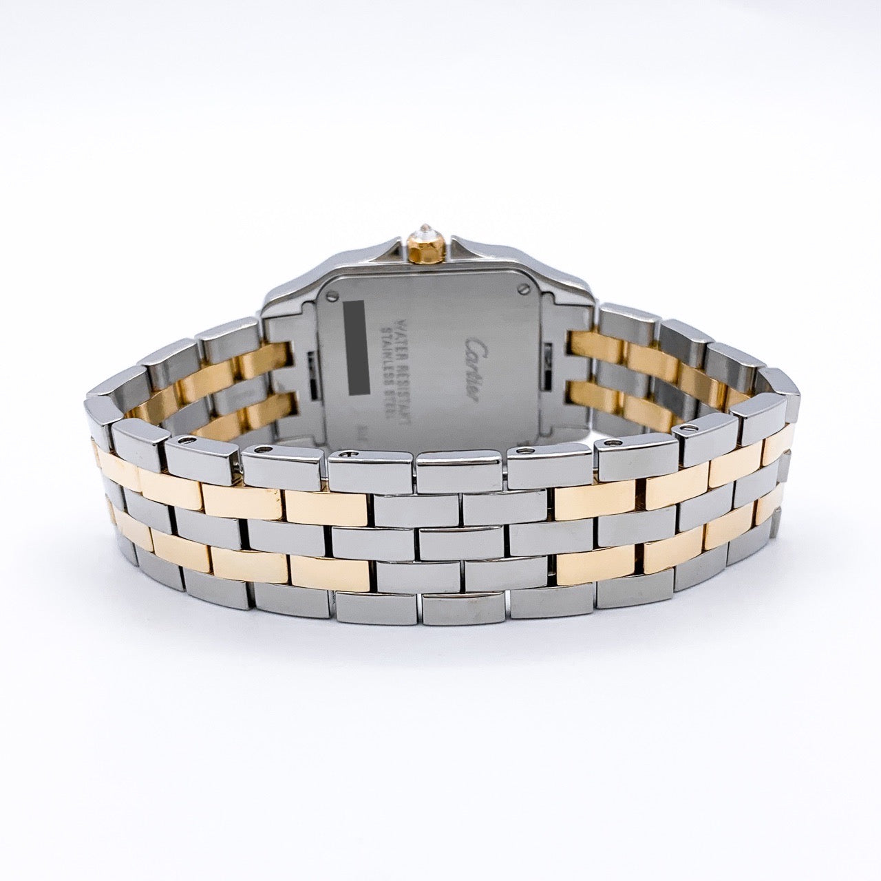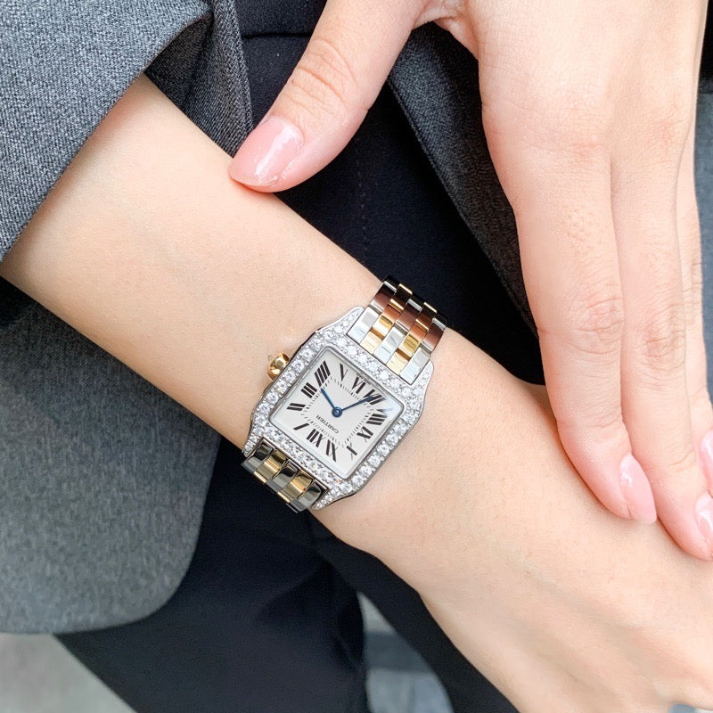 サントスの女性用として誕生した《サントスドゥモワゼル》 ベゼルのダイヤモンドが輝きを放ち、LMサイズの存在感が腕元に華やぎと個性を添える。 ハリウッド女優のニッキー・リードさん、杏さんなどが愛用するモデル。 当店職人、一級時計修理技能士による電池交換、点検、外装仕上済みで安心してご愛用いただけます。