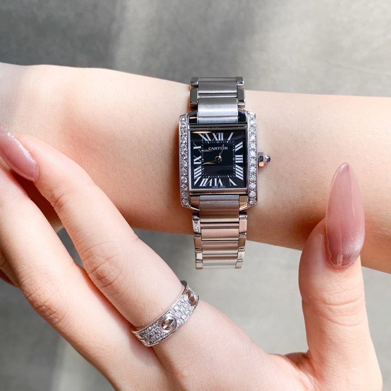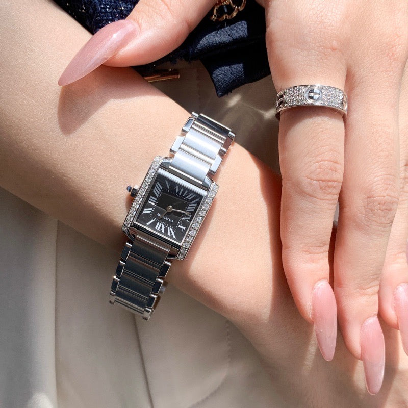 The Tank Française is a particularly popular piece in the CARTIER series and a classic first Cartier watch. Its modern, bracelet-like design complements any outfit and makes it a timeless piece. The black dial, a rare and exclusive Asia-exclusive model, creates a cool look. The lavish diamond bezel adds an extra touch of elegance. Our artisans and first-class watch repair technicians have replaced the battery, inspected the watch, and polished the exterior, so you can enjoy it with peace of mind.