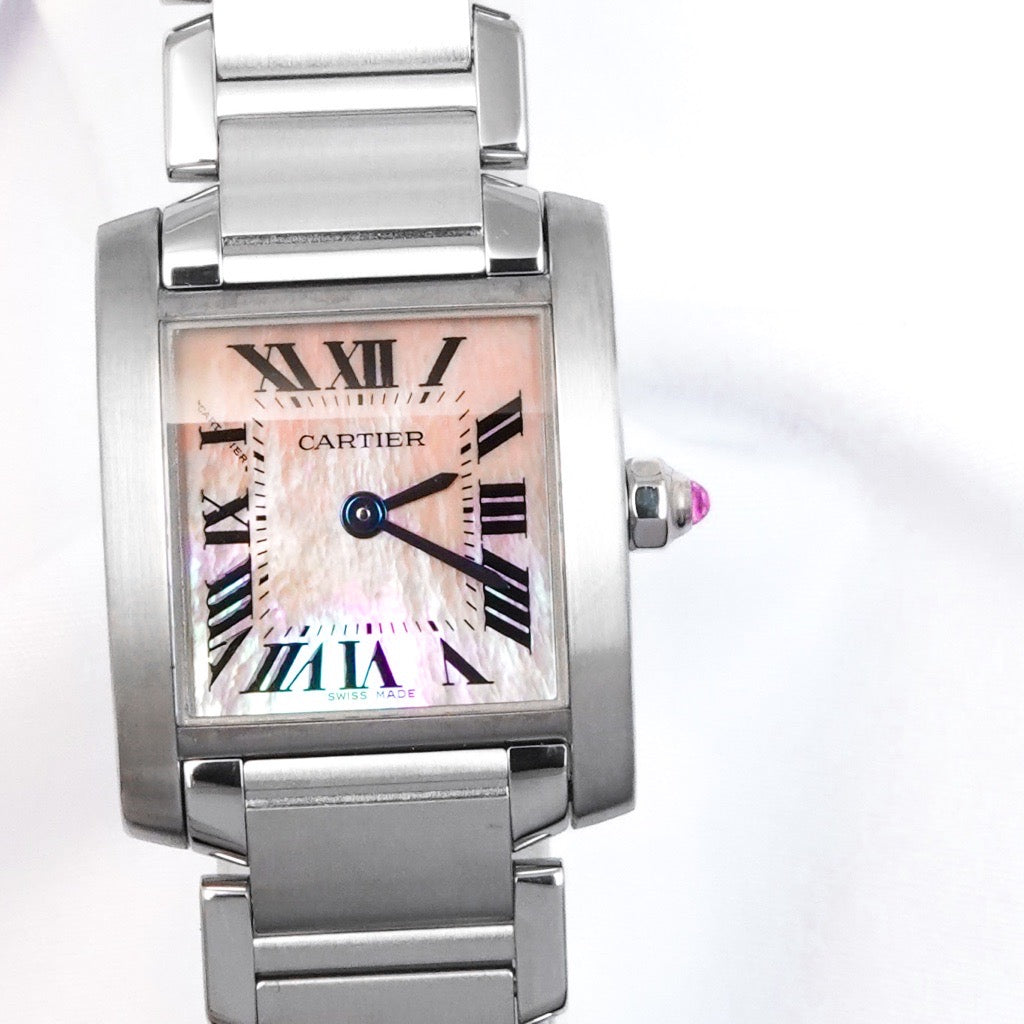 CARTIERシリーズの中でも特に人気が高く、ファーストカルティエとしても定番の《タンクフランセーズ》 モダンなブレスレットの様なデザインとピンクシェルも文字盤は光の角度で表情を変え身につける人の女性らしさを引き出す逸品。当店職人、一級時計修理技能士による電池交換、点検、外装仕上済みで安心してご愛用いただけます。