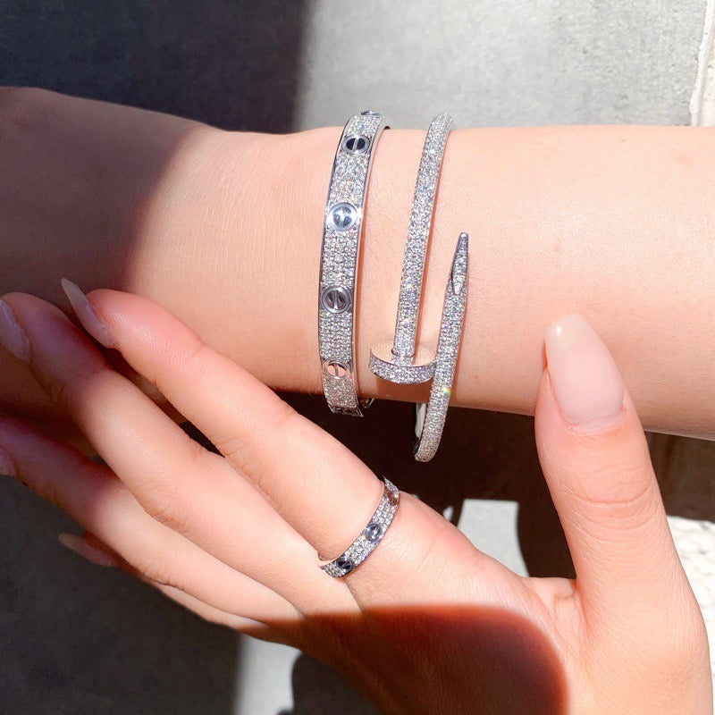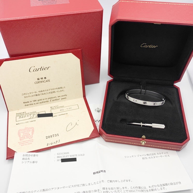 Cartier's signature Love Bracelet, which debuted in 1969, features a striking design accentuated by diamonds that line the entire surface, creating a glamorous look for any occasion, from formal to casual. This new model allows for smooth putting on and taking off, making it a popular choice for couples. It comes with a Cartier warranty and repair certificate from March 2013, and the exterior has been polished for peace of mind.