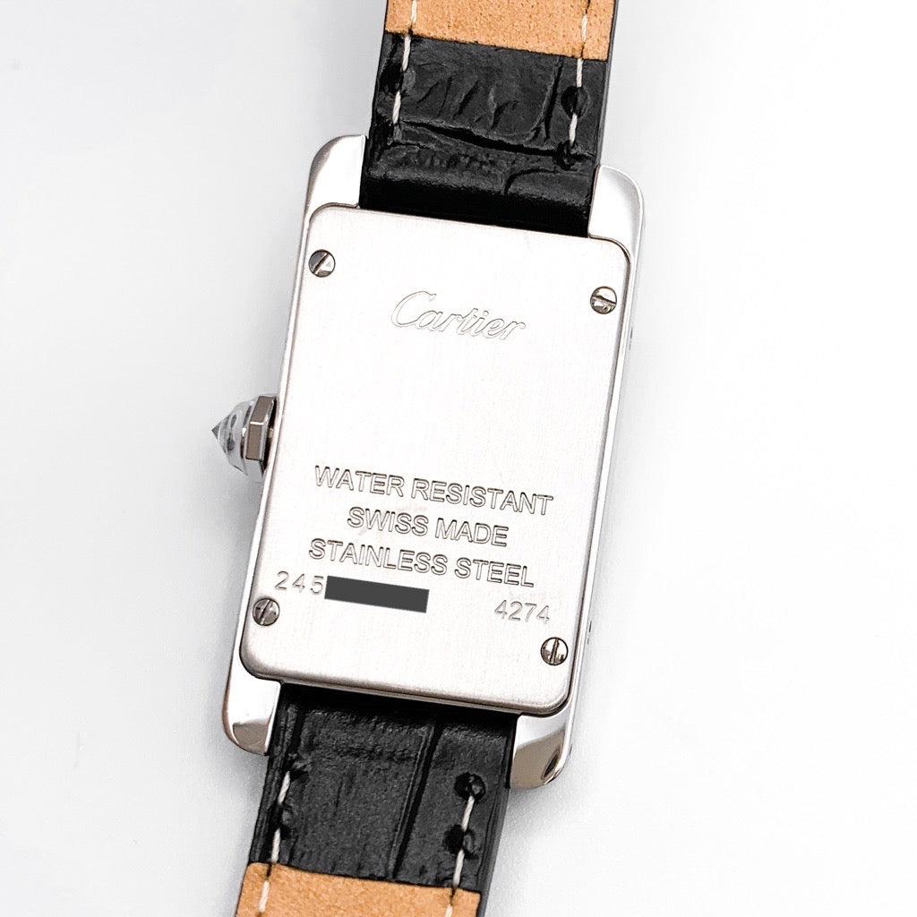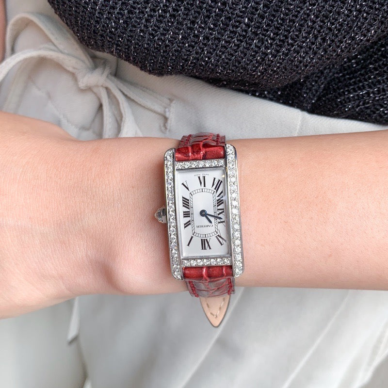 The Tank Américaine, a watch with a sharp and stylish look among the Tank series, features an elegant diamond-set bezel. Our craftsmen and first-class watch repair technicians have replaced the battery, inspected the watch, and polished the exterior, so you can enjoy it with peace of mind.