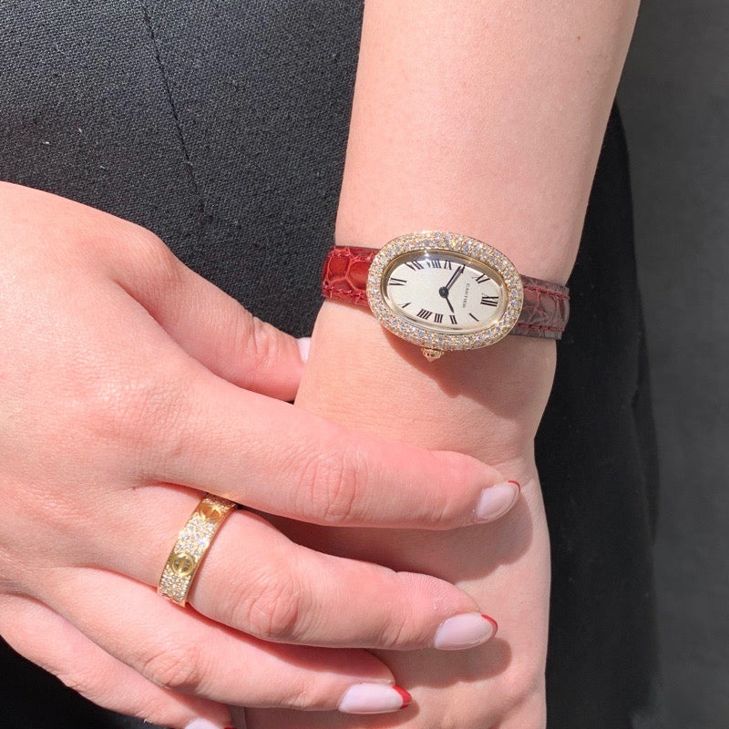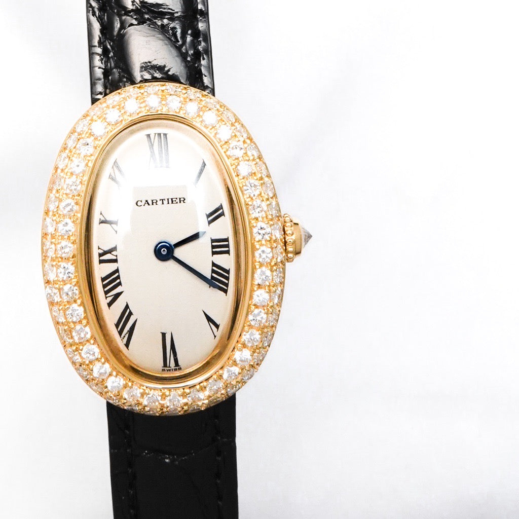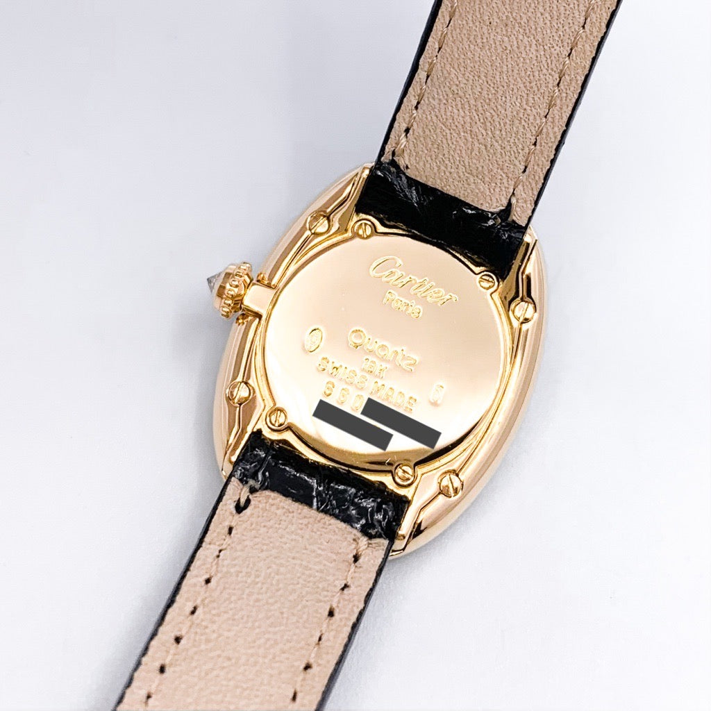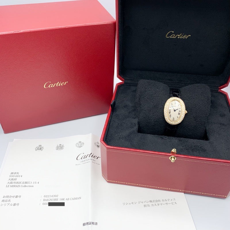 端正な美しさに気品が宿る《ベニュワール》 K18素材でしか製造されないベニュワールは、ワンランク上の大人の贅沢を感じさせてくれる。 そしてベゼルのダイヤの輝きが華やかな女性の腕元を演出する。 ベルトは新品2色が付属し、気分でお楽しみいただけます。 カルティエコンプリートサービス付きで安心してご愛用いただけます。