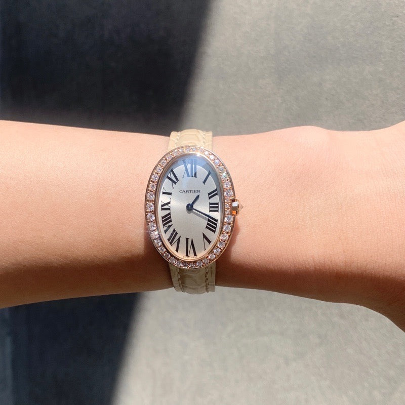 独創的なラインを描きエレガンスが漂う《ベニュワール》フェミニンなスタイルにシャープな印象がプラスされた現行モデル。PGの上品な艶と、ダイヤモンドの輝きがワンランク上の腕元を演出してくれる存在感。当店職人、一級時計修理技能士による電池交換、点検、外装仕上済みで安心してご愛用いただけます。