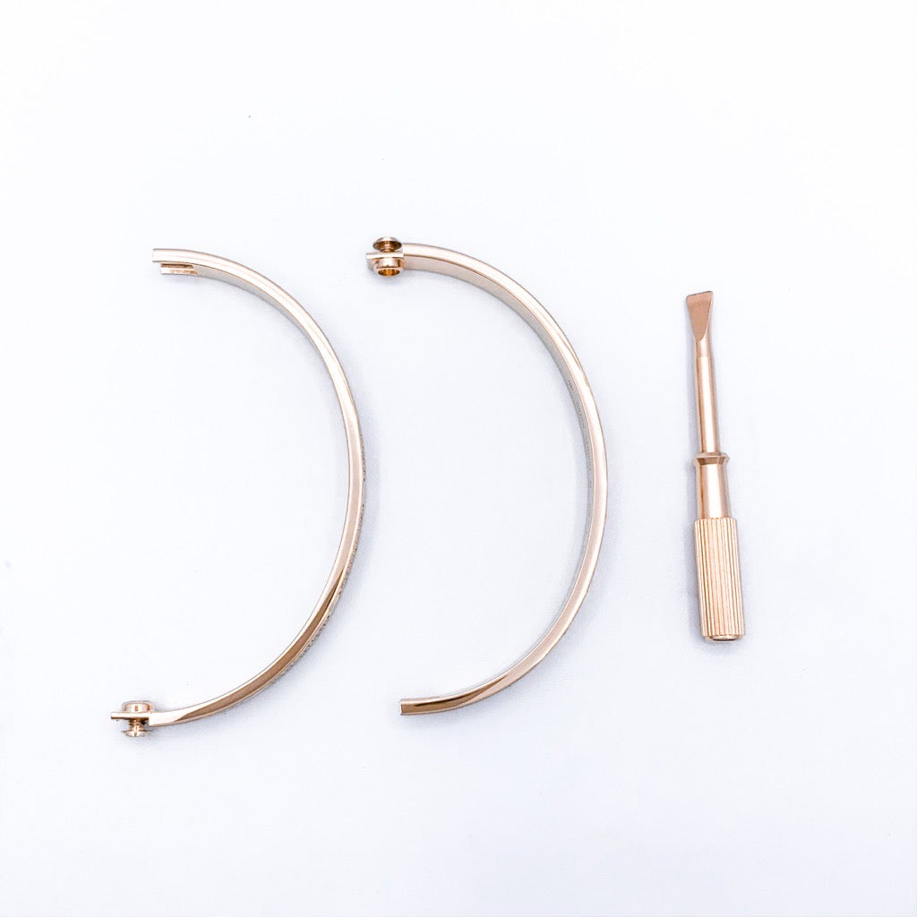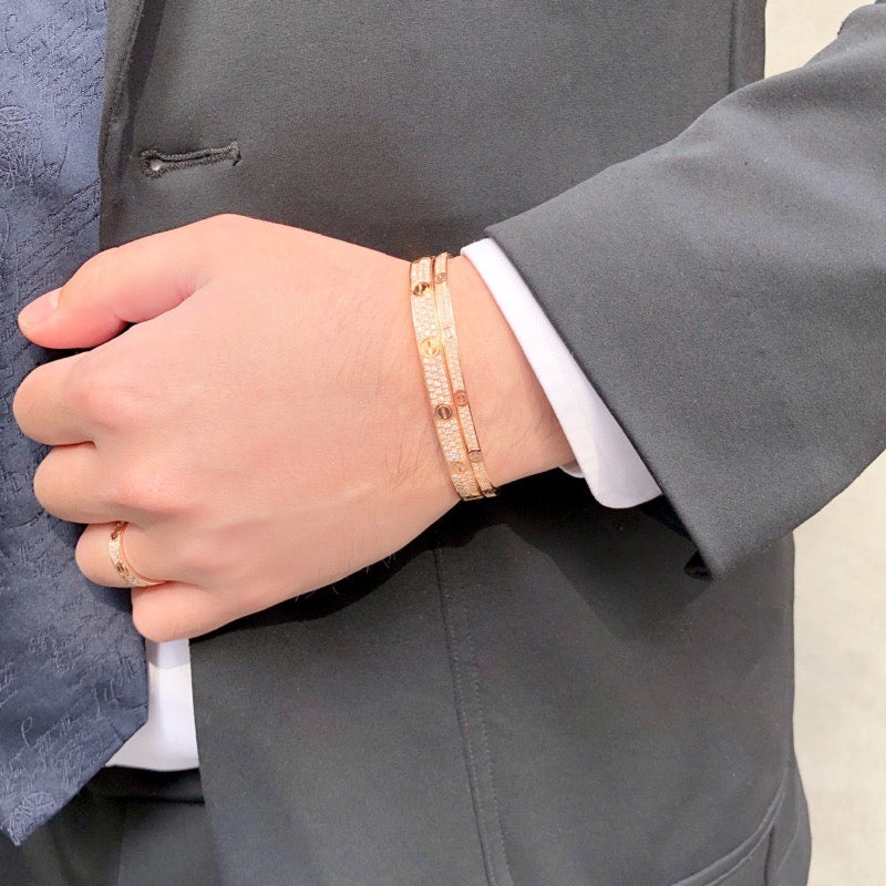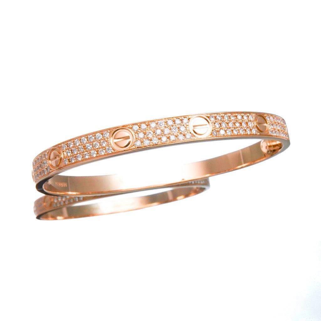 1969年にデビューしたカルティエの代表的なブレスレット《ラブブレス》 モチーフであるビスを惹き立てながら全面に並ぶダイヤモンドが、オケージョンからカジュアルスタイルまで、シーンを選ばず腕元を華やかに演出。 脱着がスムーズな新型タイプで、ペアアクセサリーとしても人気のアイテム。