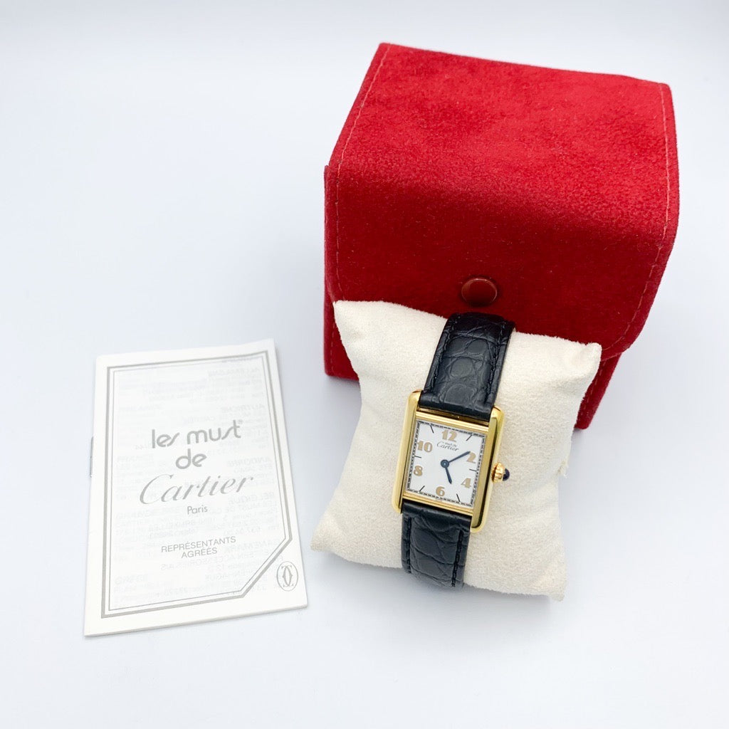 カルティエ不動の人気を誇る《タンク》 その中でも希少な飛びアラビア文字盤は現在大変入手困難で、男女問わず人気を誇る唯一無二のデザイン。 当店職人、一級時計修理技能士による電池交換、点検、外装仕上済みで安心してご愛用いただけます。