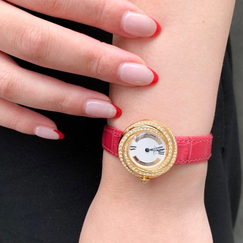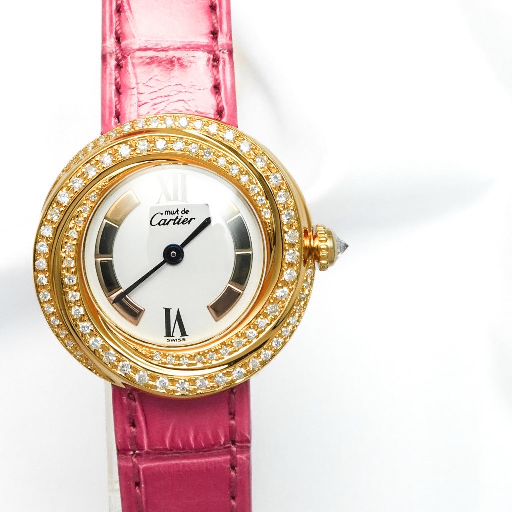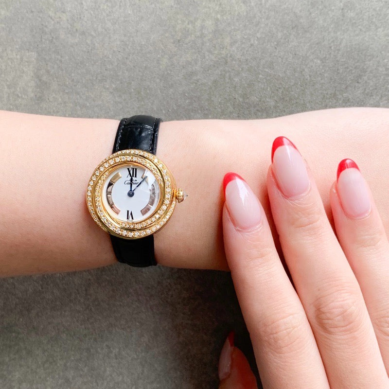 1997年に誕生した、カルティエのアイコニックジュエリー《トリニティ》のシンボルデザインを取り入れたウォッチコレクション。螺旋状に3つのリングが重なる立体的な構造が美しく、希少なトリニティ文字盤の艶と施されたダイヤが上品な輝きを放つ。カルティエ純正ユーズドレザーと純正Dバックルを付属した豪華なアイテム。 当店職人、一級時計修理技能士による電池交換、点検、外装仕上済みで安心してご愛用いただけます。