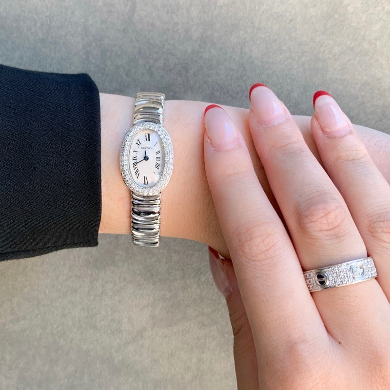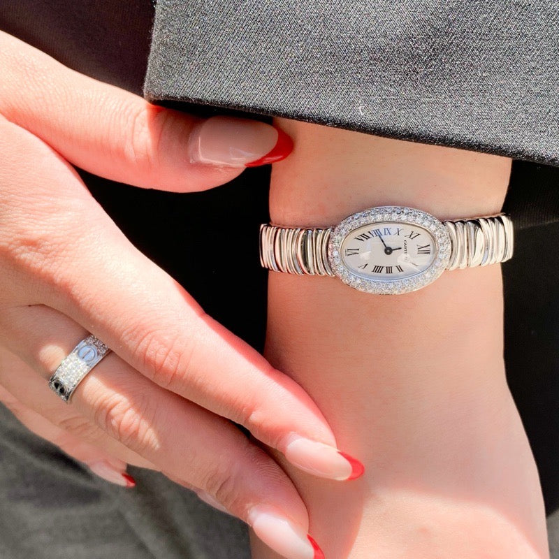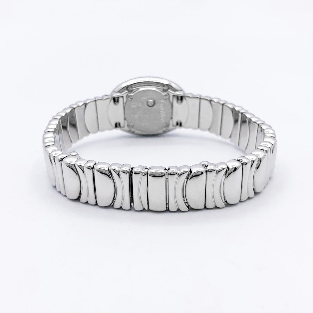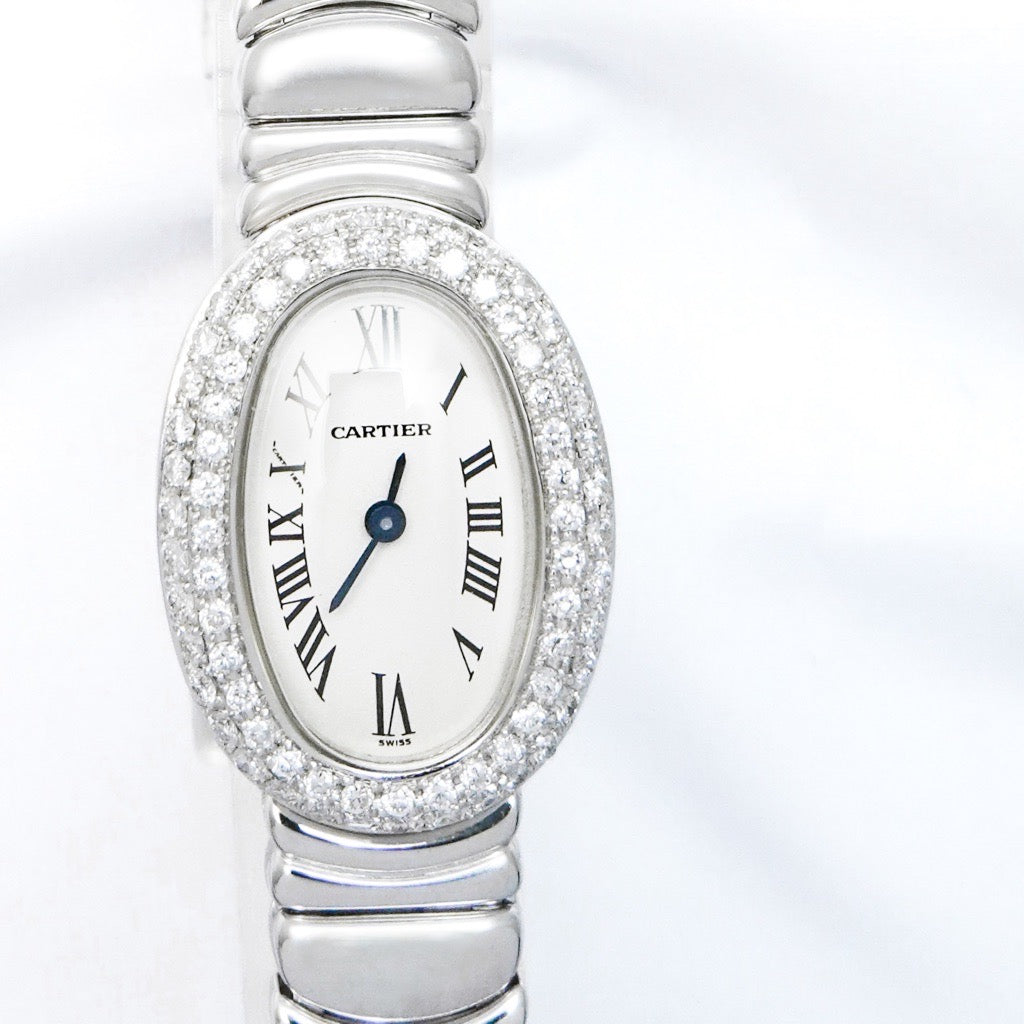 独創的なラインを描くオーバル型にエレガンスが漂う《ベニュワール》しなやかなブレスにK18WGの素材とダイヤモンドが、大人の腕元を贅沢に彩ってくれる。カルティエ修理証明書付き・カルティエによる電池交換、点検済みで安心してご愛用いただけます。