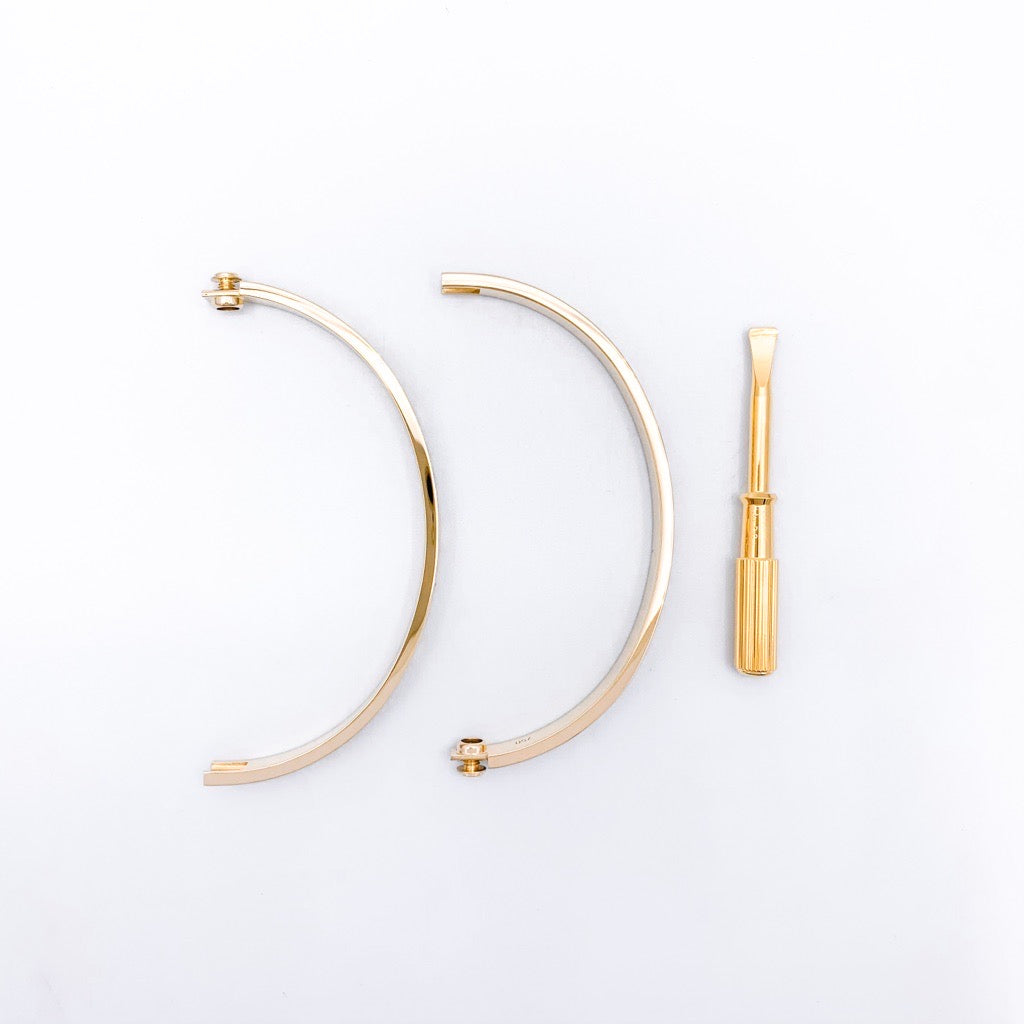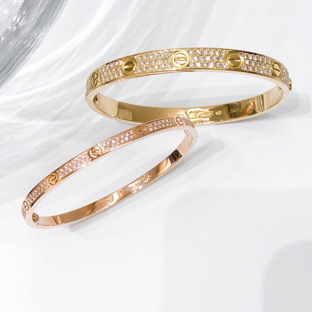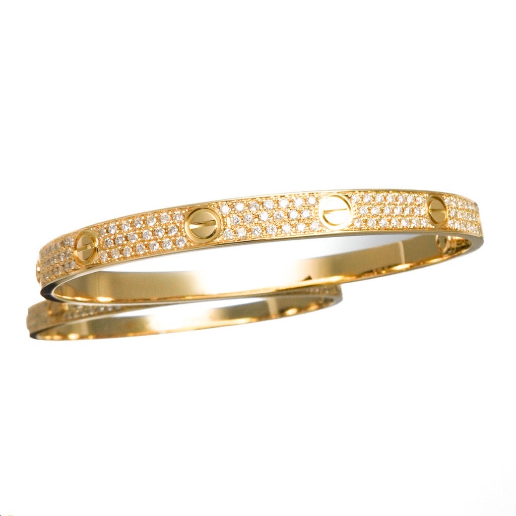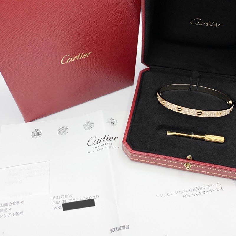 1969年にデビューしたカルティエの代表的なブレスレット《ラブブレス》 モチーフであるビスを惹き立てながら全面に並ぶダイヤモンドが、オケージョンからカジュアルスタイルまで、シーンを選ばず腕元を華やかに演出。 脱着がスムーズな新型タイプで、ペアアクセサリーとしても人気のアイテム。 カルティエ修理証明書付き&外装仕上げ済みで安心してご愛用いただけます。
