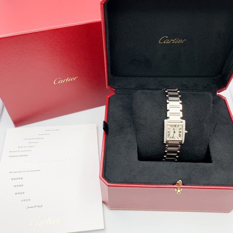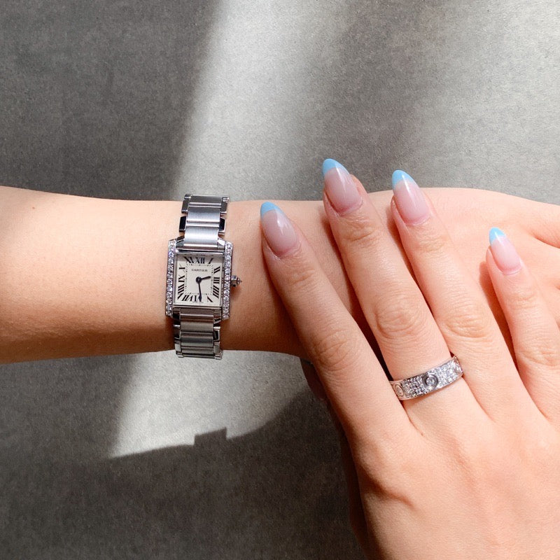 CARTIERシリーズの中でも特に人気が高く、ファーストカルティエとしても定番の《タンクフランセーズ》 ベゼルとリューズに施されたダイヤが腕元を華やかに彩を添え、永く愛せる腕時計。当店職人、一級時計修理技能士による電池交換、点検、外装仕上済みで安心してご愛用いただけます。