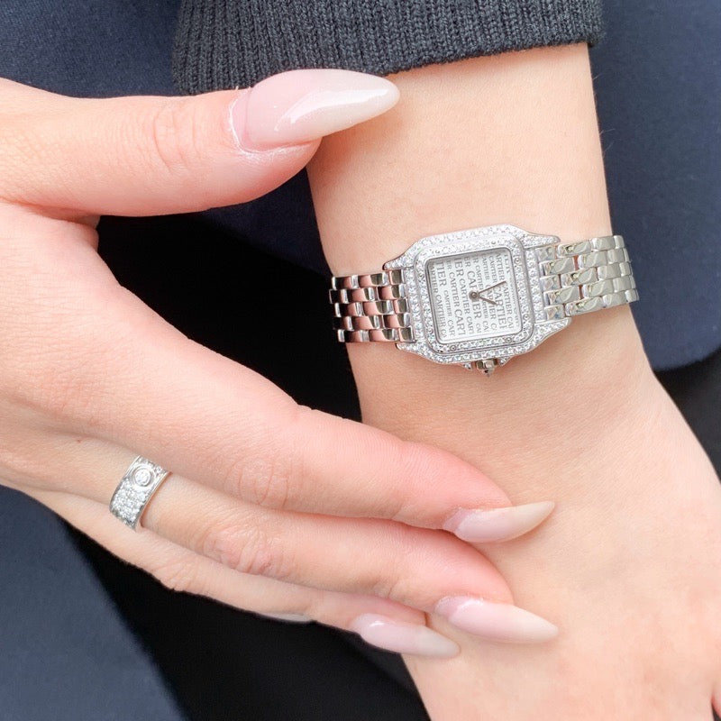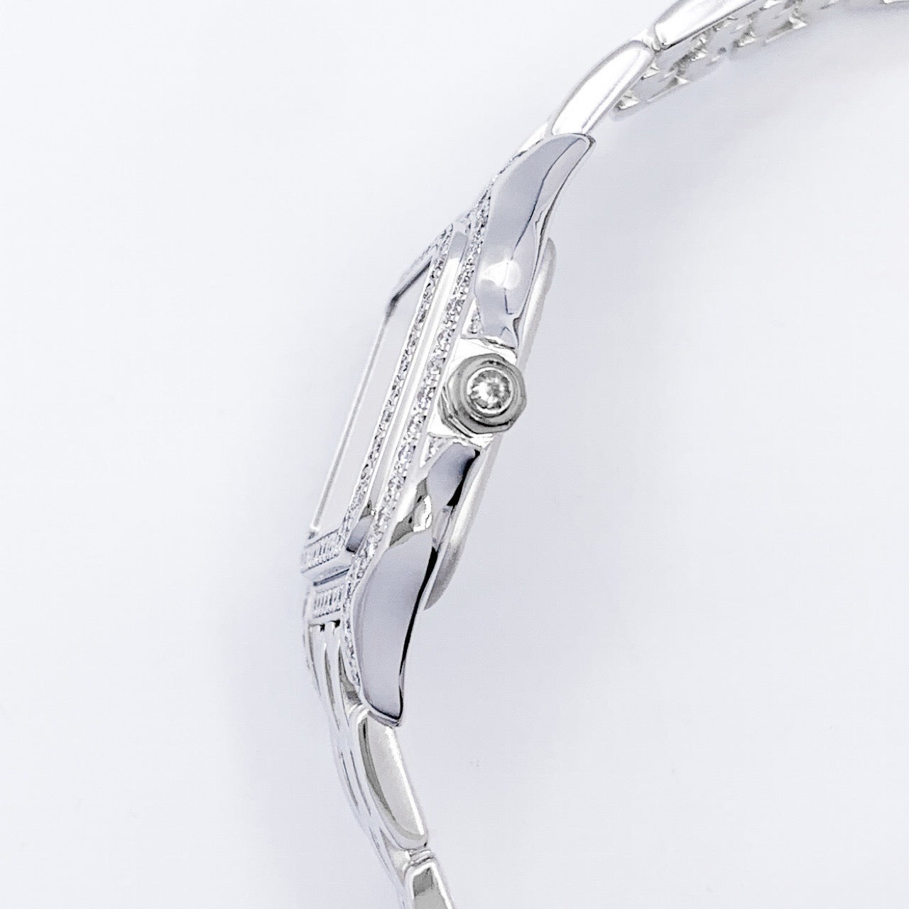 1983年に誕生して以降、不動の人気を誇る《パンテール》 ホワイトゴールドの素材で作られ、ベゼルに贅沢に施されたダイヤモンドは、腕元を華やかに演出。 カルティエのロゴが描かれた文字盤が一眼を引き、大事な日を共にするにぴったりな高級感漂う一生物の腕時計。 2001年8月のカルティエ保証書付き&当店職人、一級時計修理技能士による電池交換、点検、外装仕上済みで安心してご愛用いただけます。*