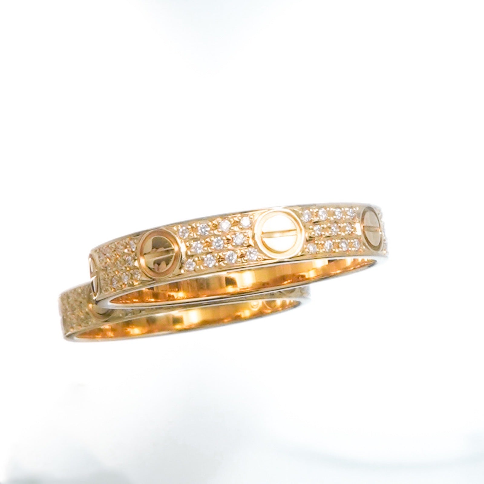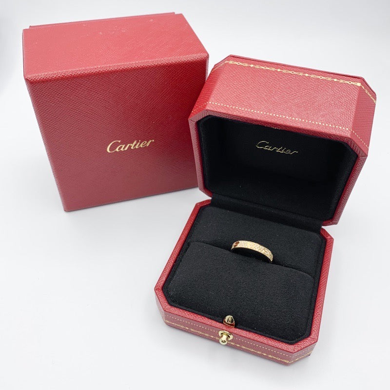 時を経ても褪せることのない普遍的なデザインで、カルティエジュエリーのなかでも不動の人気を誇る《ラブリング》 こちらのミニサイズは華奢で繊細な印象に。ペアアクセサリーとしても愛される名品。 モチーフであるビスを惹き立てるように、周りをダイヤモンドで埋め尽くしたフルパヴェダイヤ仕様。 ファッションリングとしても優秀で、印象に残る指元へ。 外装仕上げ済みで安心してご愛用いただけます。