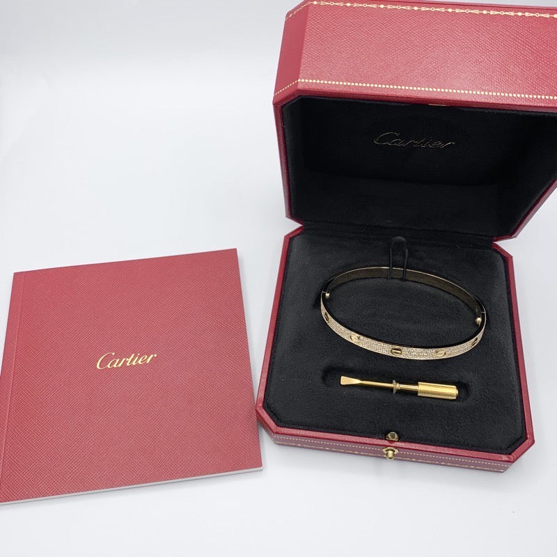1969年にデビューしたカルティエの代表的なブレスレット《ラブブレス》 モチーフであるビスを惹き立てながら全面に並ぶダイヤモンドが、オケージョンからカジュアルスタイルまで、シーンを選ばず腕元を華やかに演出。 脱着がスムーズな新型タイプで、ペアアクセサリーとしても人気のアイテム。 外装仕上げ済みで安心してご愛用いただけます。