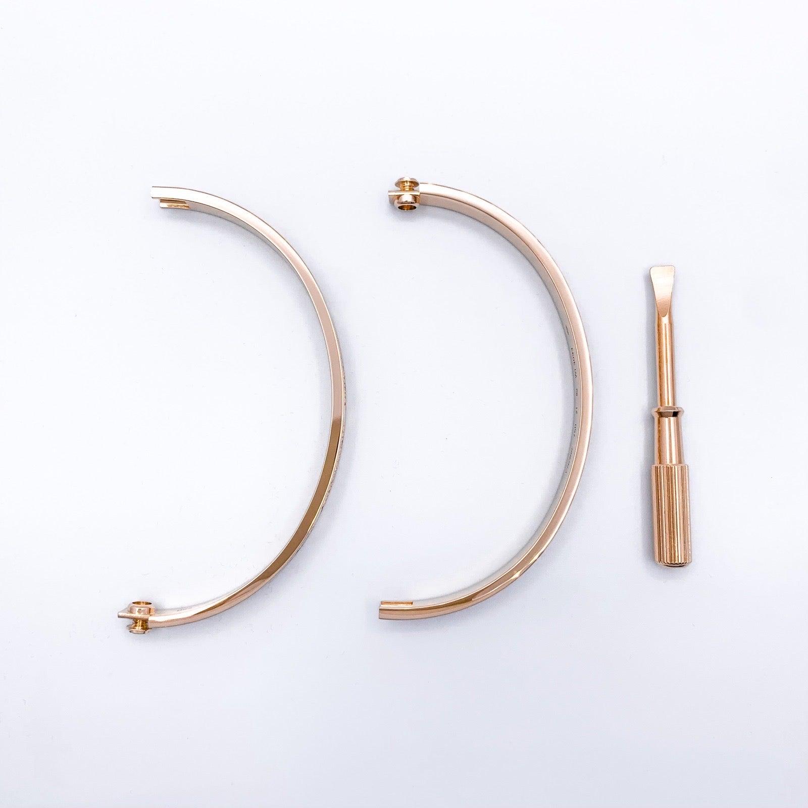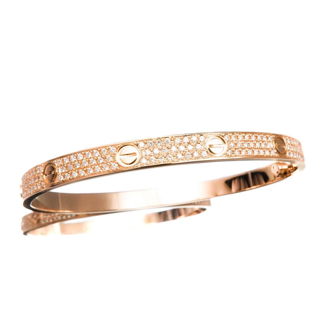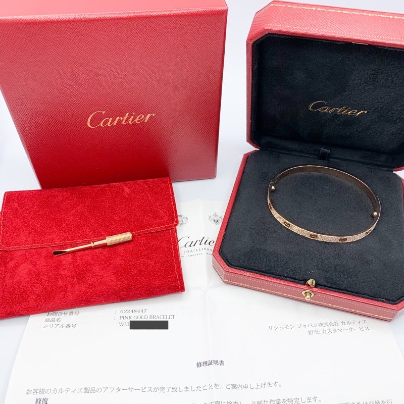 1969年にデビューしたカルティエの代表的なブレスレット《ラブブレス》 モチーフであるビスを惹き立てながら全面に並ぶダイヤモンドが、オケージョンからカジュアルスタイルまで、シーンを選ばず腕元を華やかに演出。 脱着がスムーズな新型タイプで、ペアアクセサリーとしても人気のアイテム。 カルティエ修理証明書付き・外装仕上げ済みで安心してご愛用いただけます。