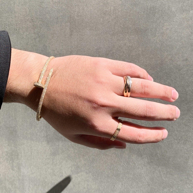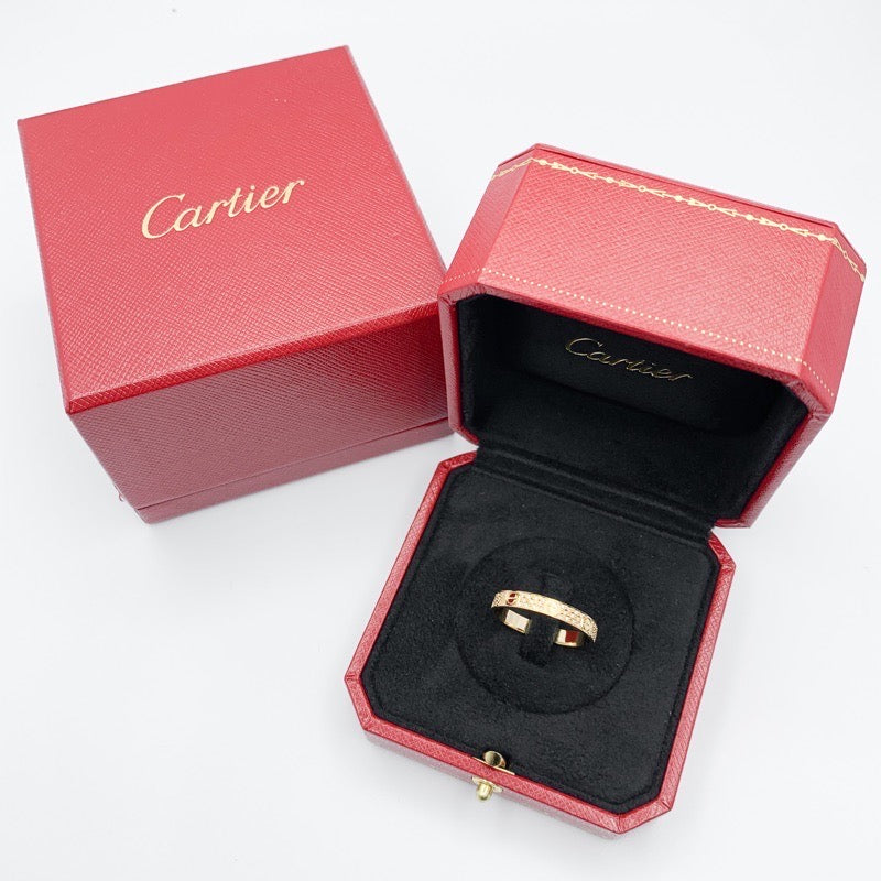 時を経ても褪せることのない普遍的なデザインで、カルティエジュエリーのなかでも不動の人気を誇る《ラブリング》 こちらのミニサイズは華奢で繊細な印象に。ペアアクセサリーとしても愛される名品。 モチーフであるビスを惹き立てるように、周りをダイヤモンドで埋め尽くしたフルパヴェダイヤ仕様。 ファッションリングとしても優秀で、印象に残る指元へ。 外装仕上げ済みで安心してご愛用いただけます。