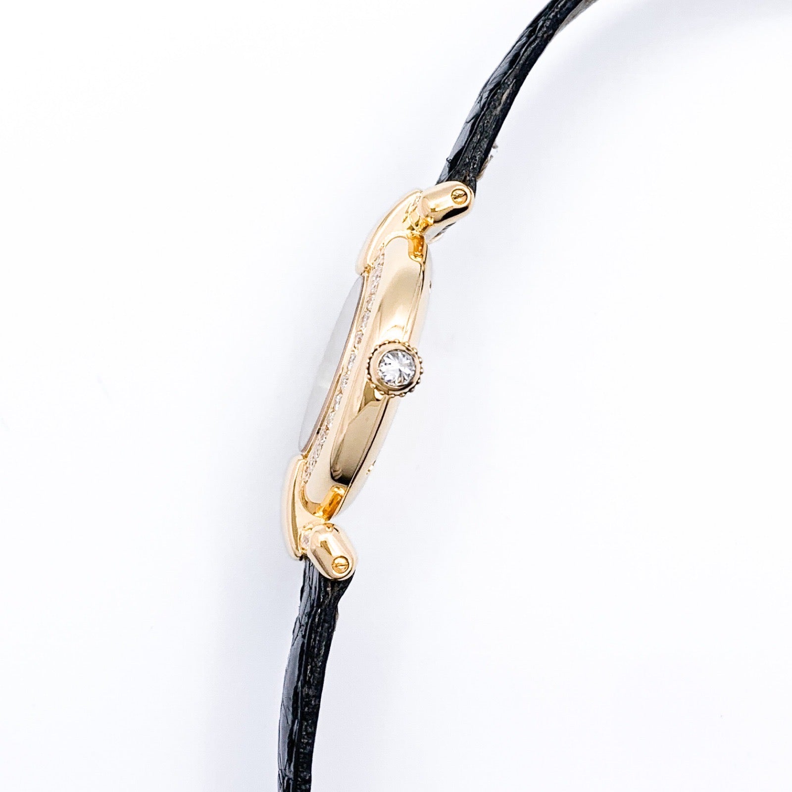 立体的にデザインされたダブルラインが美しい《コリゼ》シンプルなローマン文字盤と丸みのある女性らしいベゼルが特徴の、大人の女性にふさわしいジュエリーウォッチ。K18YGとダイヤモンドの輝きでさらに上品な高級感のある印象に。カルティエコンプリートサービス済み&カルティエ保証書付き。
