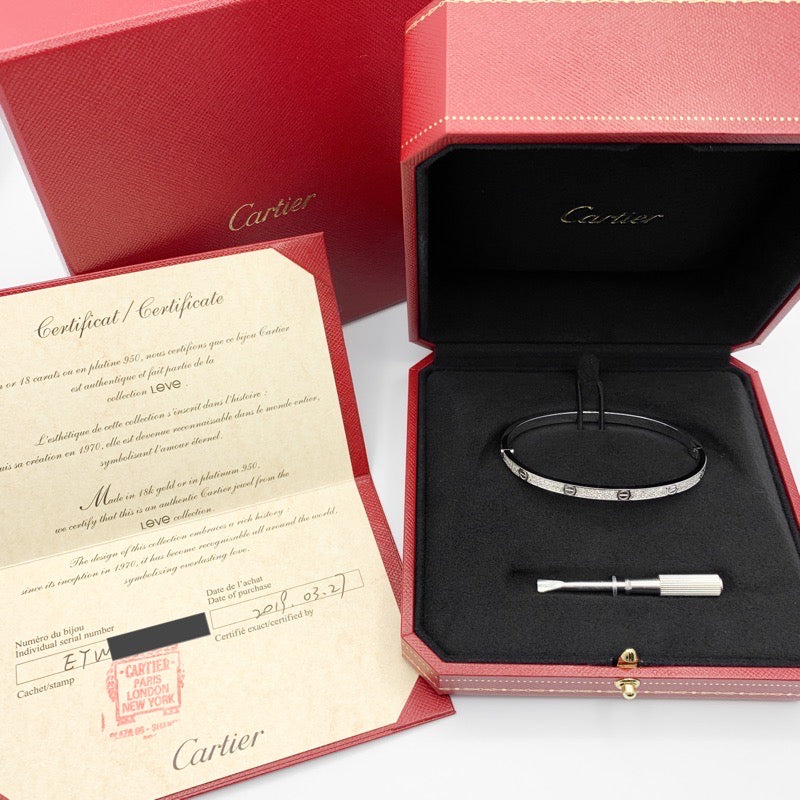 1969年にデビューしたカルティエの代表的なブレスレット《ラブブレス》 モチーフであるビスを惹き立てながら全面に並ぶダイヤモンドが、オケージョンからカジュアルスタイルまで、シーンをを選ばず腕元を華やかに演出。 脱着がスムーズな新型のSMサイズで、ペアアクセサリーとしても人気のアイテム。 2019年3月のカルティエ保証書付き&外装新品仕上げ済みで安心してご愛用いただけます。