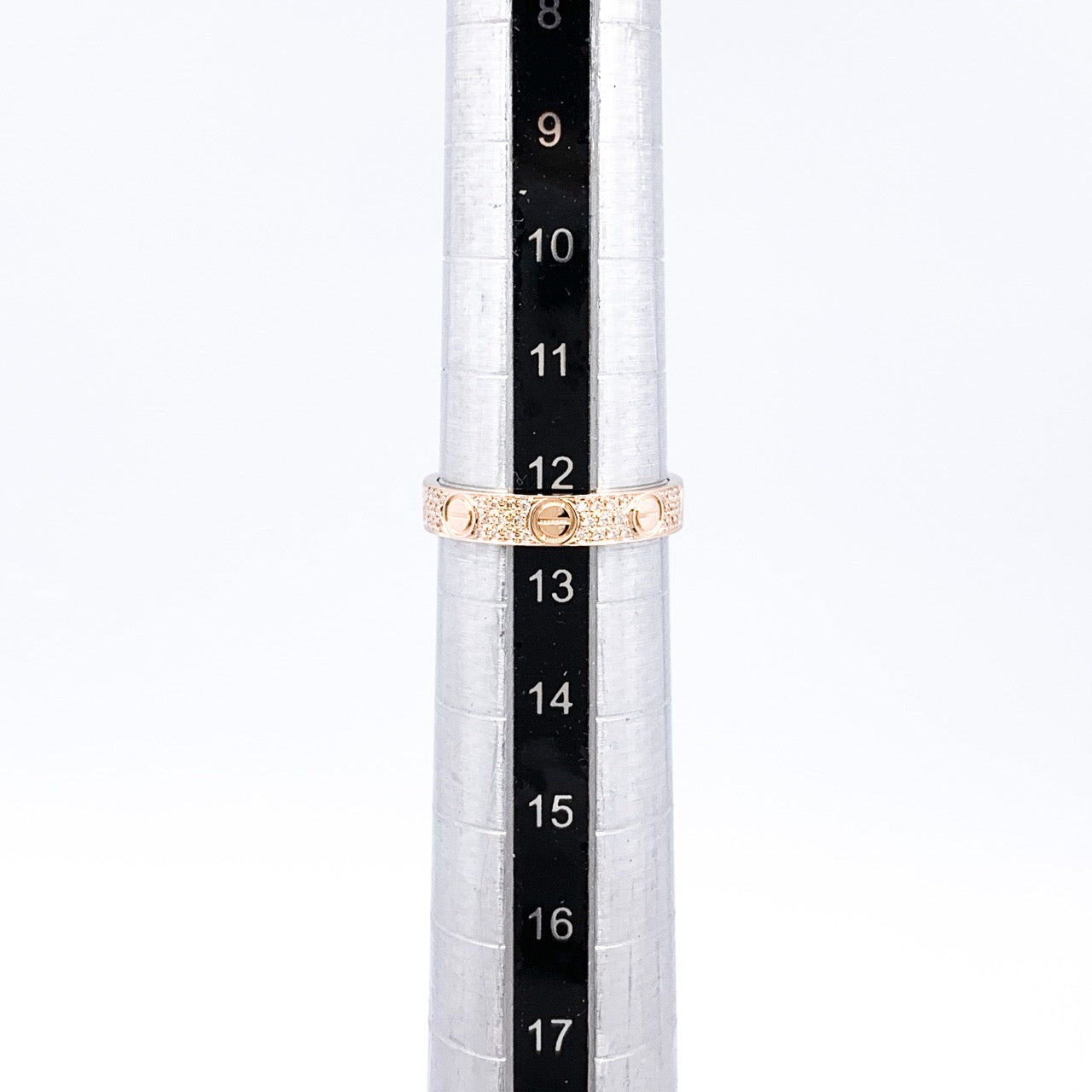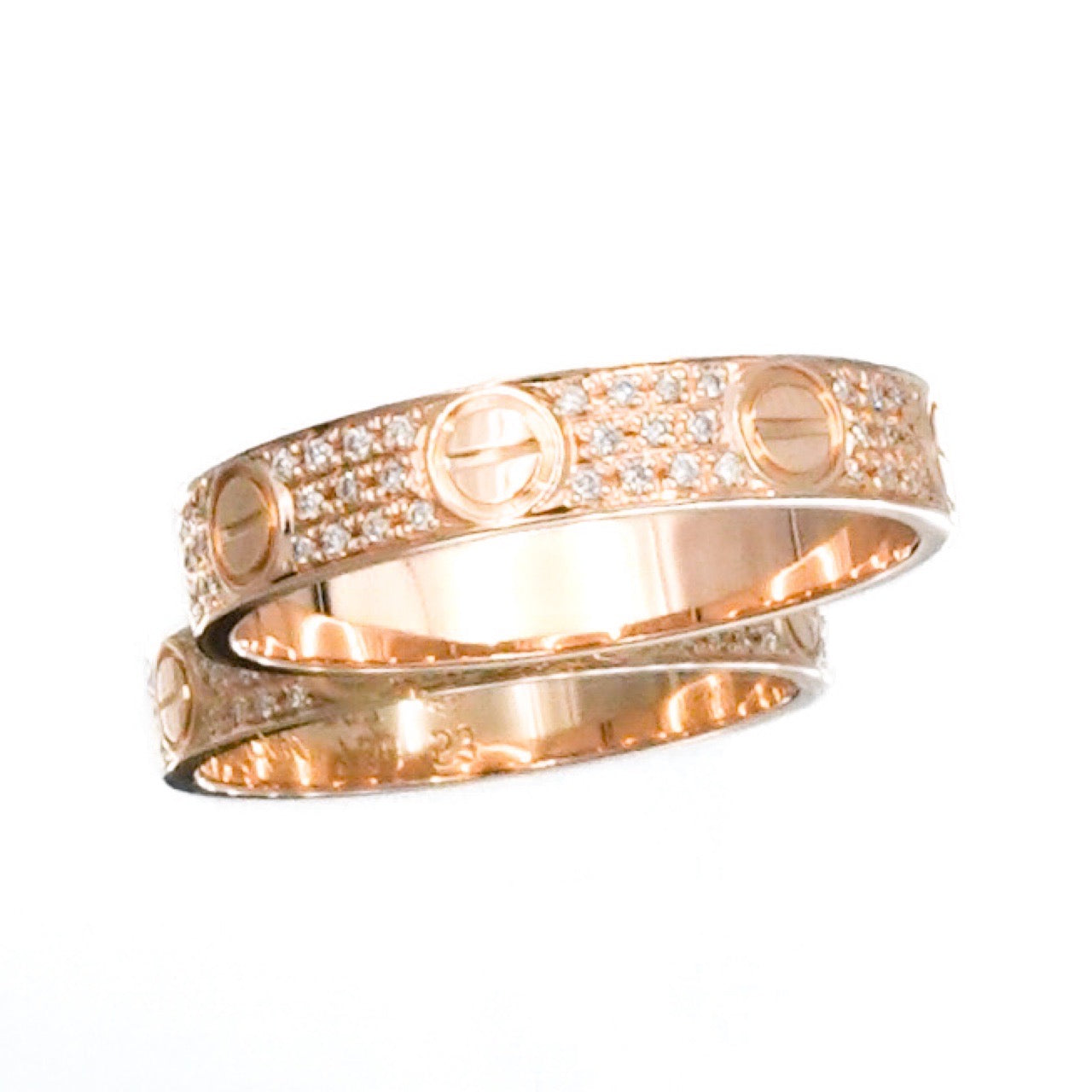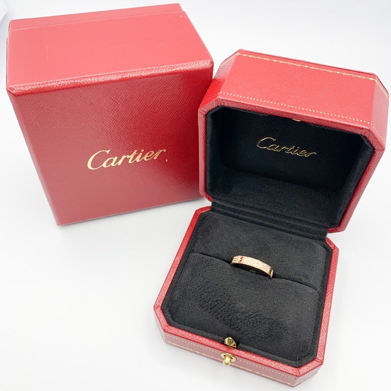 時を経ても褪せることのない普遍的なデザインで、カルティエジュエリーのなかでも不動の人気を誇る《ラブリング》 こちらのミニサイズは華奢で繊細な印象に。ペアアクセサリーとしても愛される名品。 モチーフであるビスを惹き立てるように、周りをダイヤモンドで埋め尽くしたフルパヴェダイヤ仕様。 ファッションリングとしても優秀で、印象に残る指元へ。 外装仕上げ済みで安心してご愛用いただけます。
