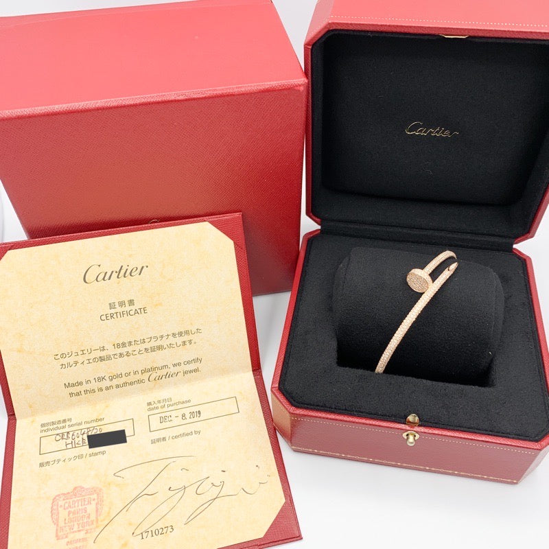 一本の釘から誕生したモダンなユニセックスジュエリー。 斬新で革新的なデザインとシンプルさで、デイリーなジュエリーとして魅力を放つ。 全体に施されたダイヤモンドが、腕元の印象を格上げ。 2019年12月のカルティエ保証書付き&外装新品仕上済みで安心してご愛用いただけます。