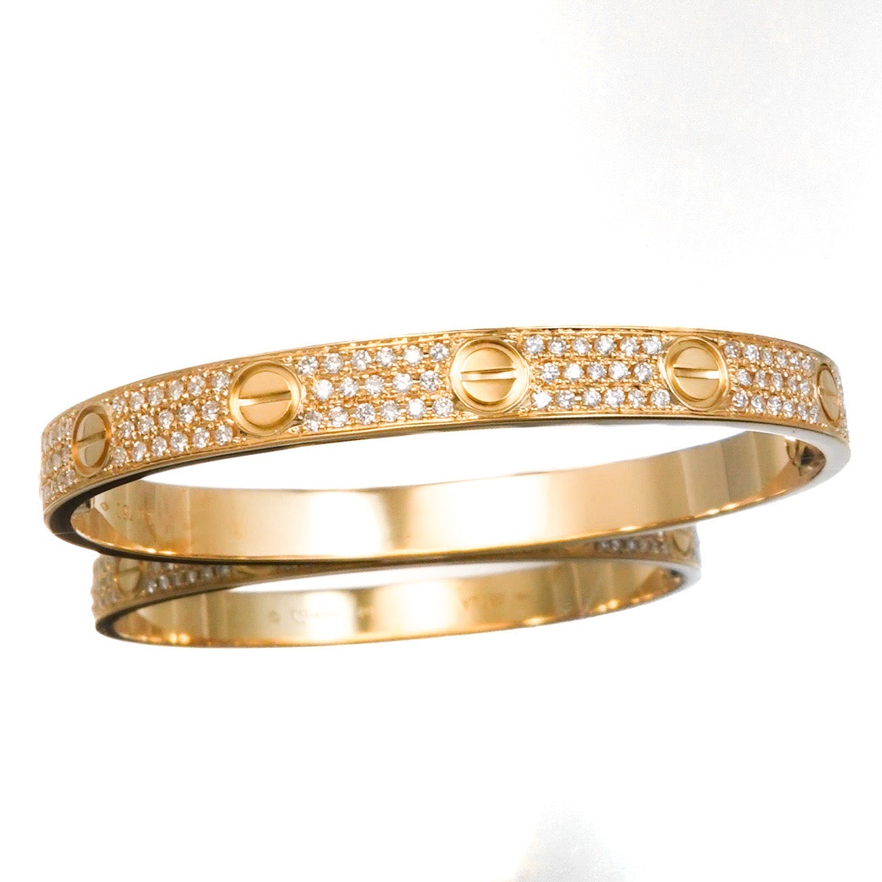 1969年にデビューしたカルティエの代表的なブレスレット《ラブブレス》 モチーフであるビスを惹き立てながら全面に並ぶダイヤモンドが、オケージョンからカジュアルスタイルまで、シーンを選ばず腕元を華やかに演出。 脱着がスムーズな新型タイプで、ペアアクセサリーとしても人気のアイテム。2018年9月のカルティエ保証書付き&外装仕上げ済みで安心してご愛用いただけます。