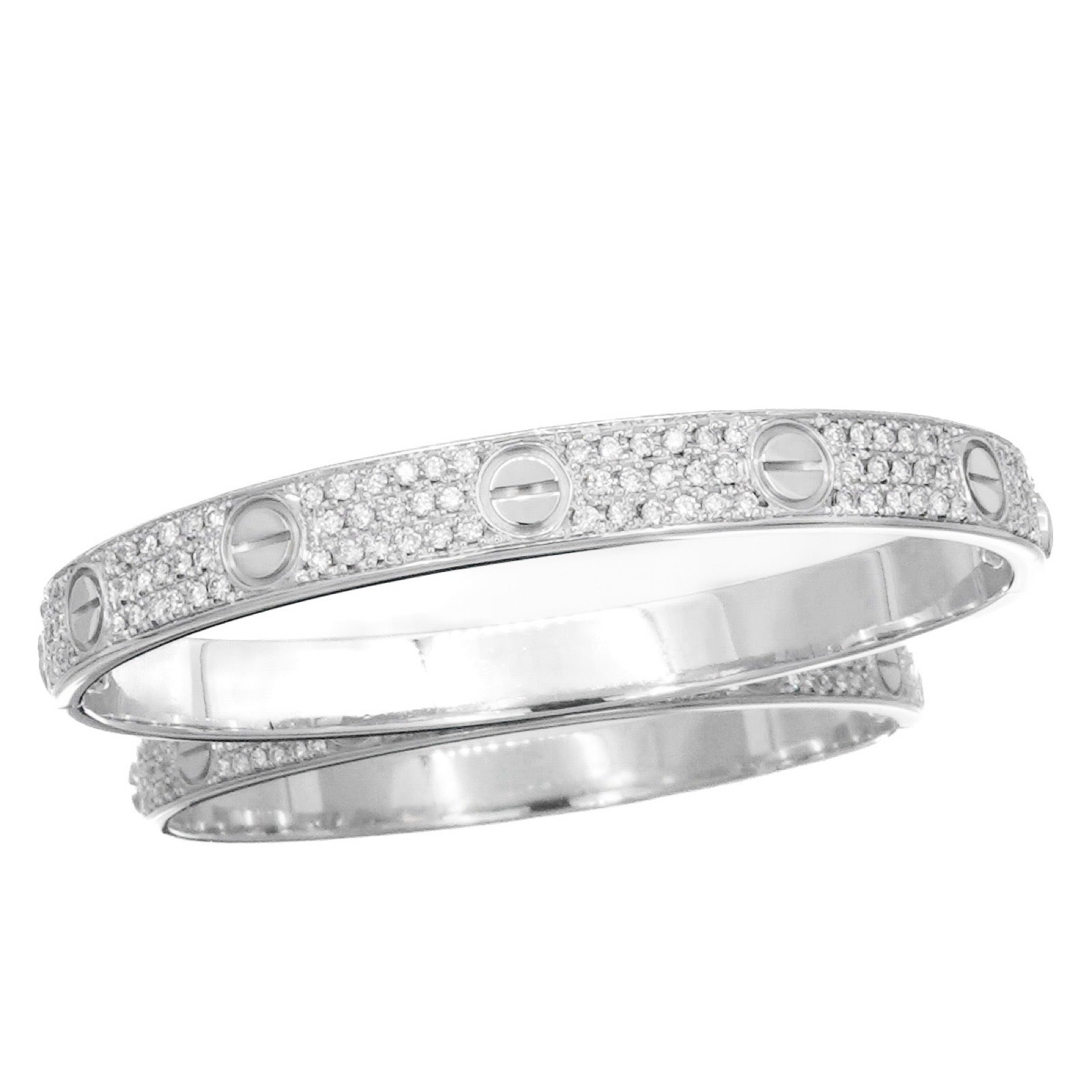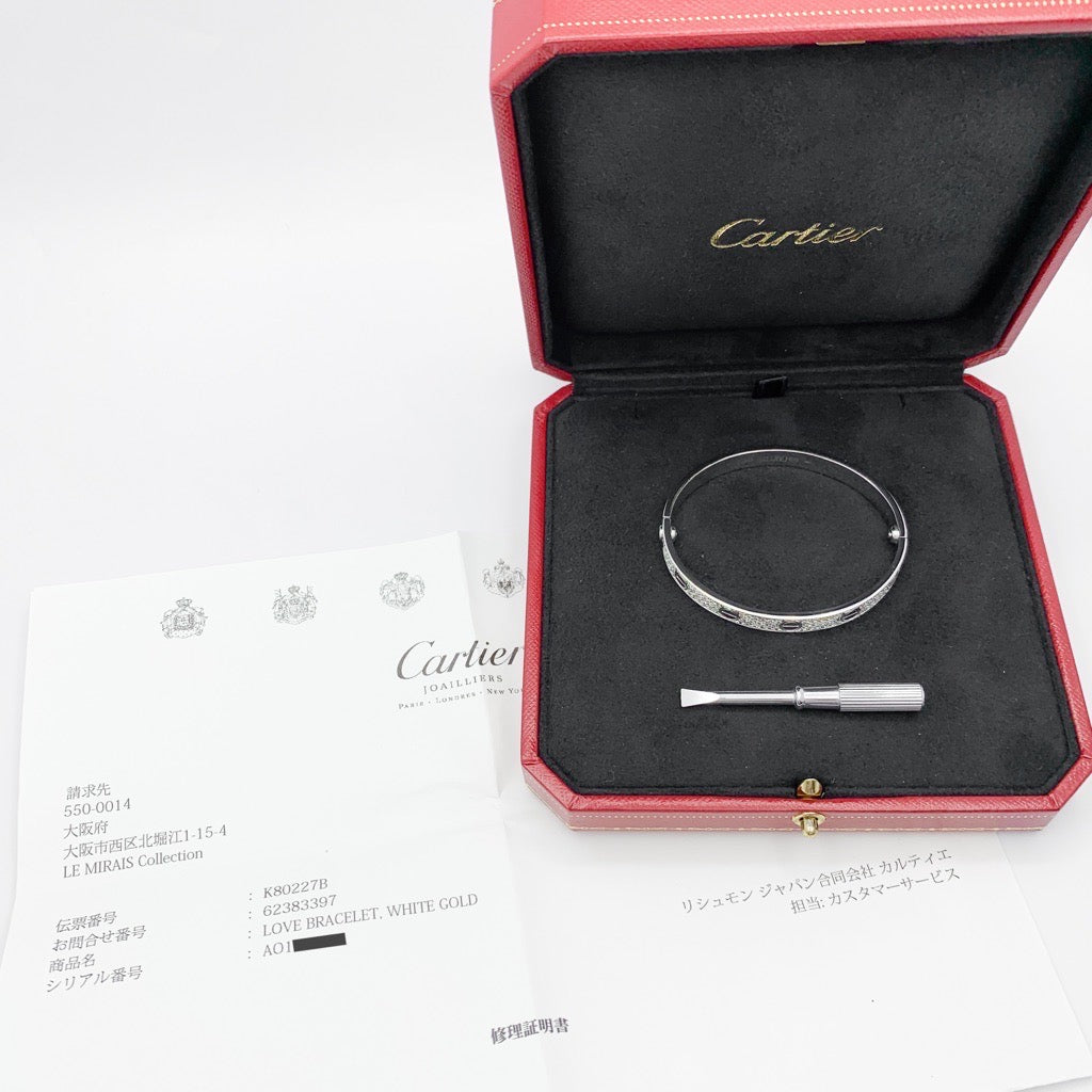 1969年にデビューしたカルティエの代表的なブレスレット《ラブブレス》 モチーフであるビスを惹き立てながら全面に並ぶダイヤモンドが、オケージョンからカジュアルスタイルまで、シーンを選ばず腕元を華やかに演出。 ペアアクセサリーとしても人気のアイテム。 外装新品仕上げ済みで安心してご愛用いただけます。