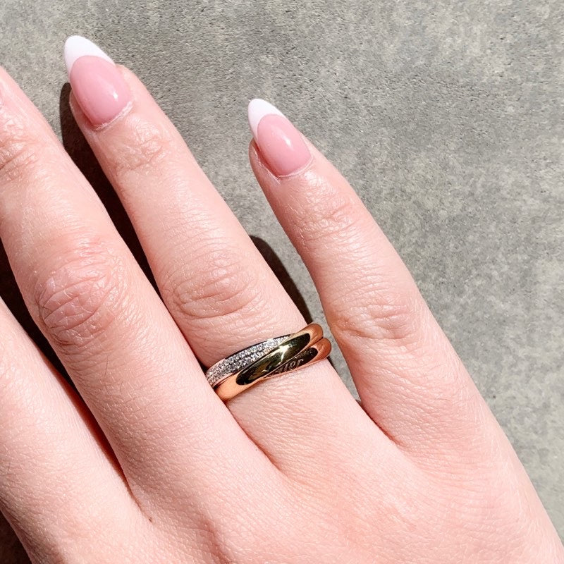 ルイ・カルティエの豊かな想像力によって1924年に誕生した、歴史の長いトリニティリングは、メゾンを象徴するジュエリーのひとつ。 永く愛用できるペアアクセサリーとしても人気の名品。 カルティエらしい芸術性の高いデザインで日常のスタイルに彩りを添える。 中でもこちらのSMサイズは華奢で繊細な印象に。 外装仕上げ磨き済で安心してご愛用いただけます。