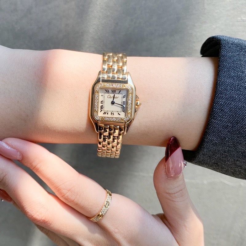 CARTIERを代表するアイコン ウォッチ《パンテール ドゥ カルティエ》K18YGの素材とベゼルに施されたダイヤモンドが、唯一無二の華やかな気品を腕元に添える。K18モデルはミニサイズが多い中、生産が少ないSMサイズ。ロゴが立体的にデザインされた文字盤がひとめを惹く逸品。一級時計修理技能士によるオーバーホール、点検、外装仕上済みで安心してご愛用いただけます。*