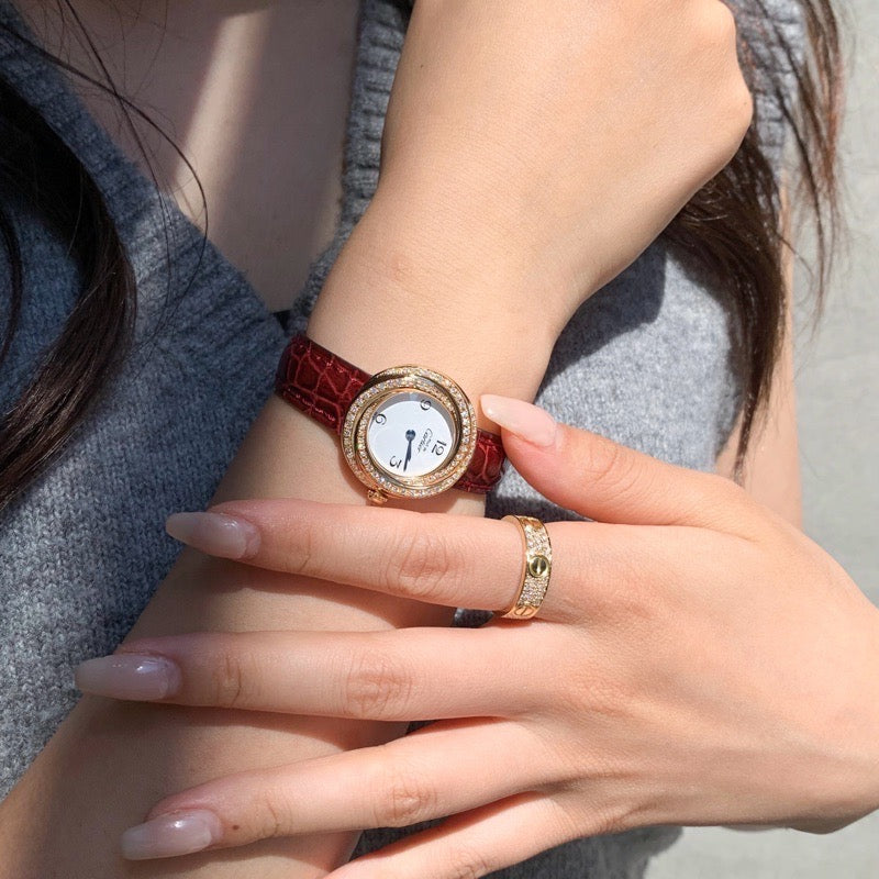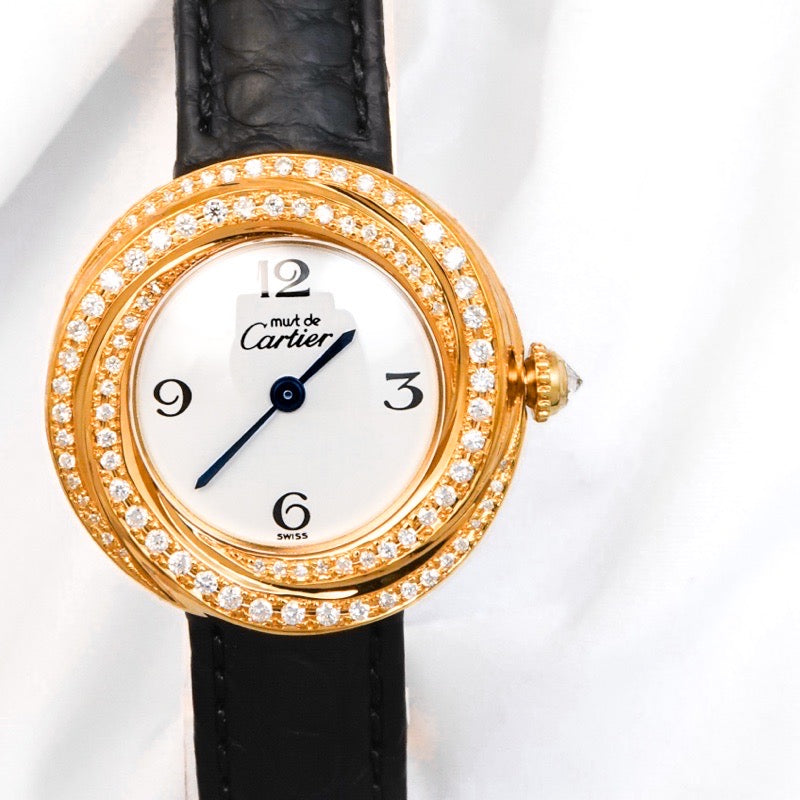 1997年に誕生した、カルティエのアイコニックジュエリー《トリニティ》のシンボルデザインを取り入れたウォッチコレクション。螺旋状に3つのリングが重なる立体的な構造が美しく、ベゼルに施されたダイヤが上品な輝きを放つ。当店職人、一級時計修理技能士による電池交換、点検、外装仕上済みで安心してご愛用いただけます。