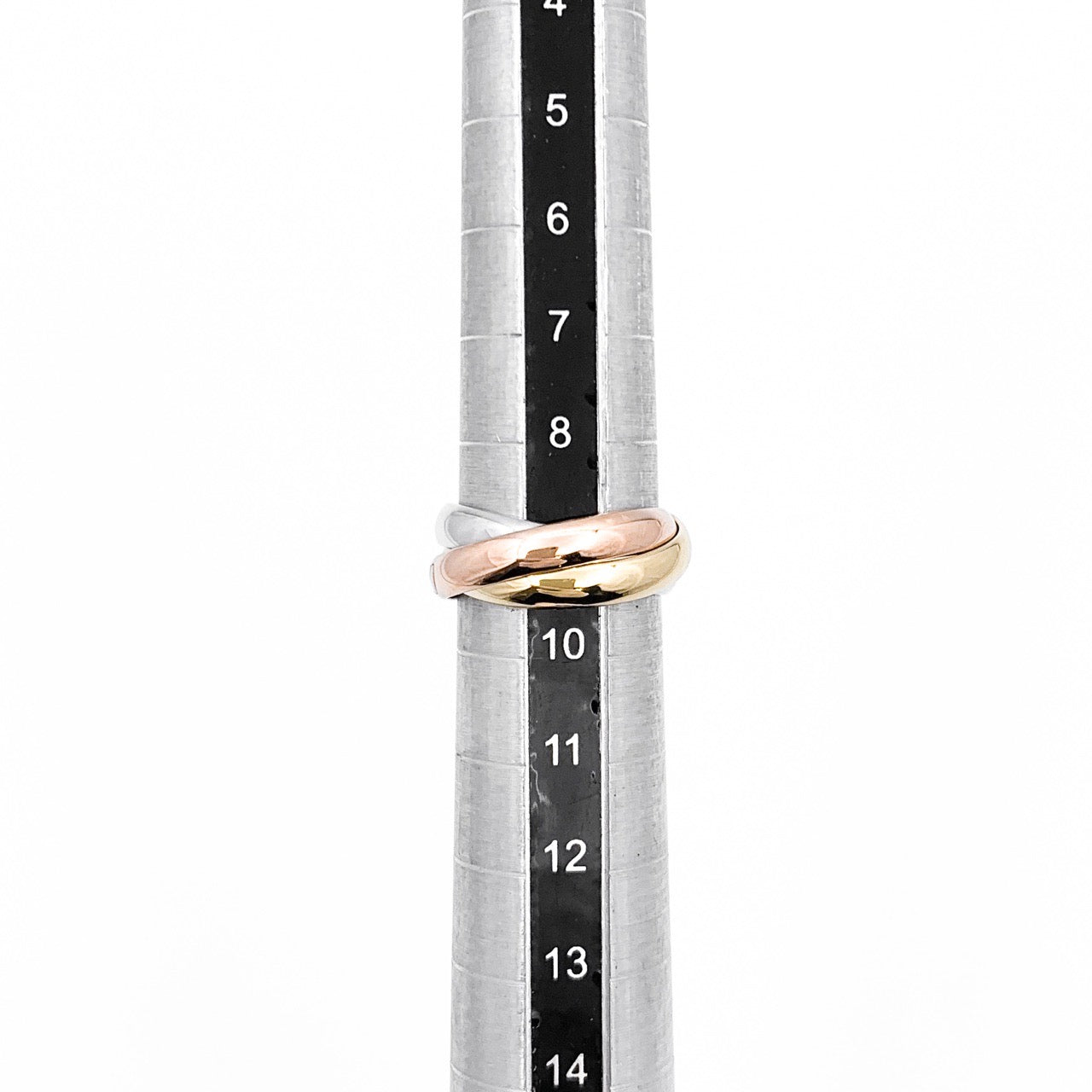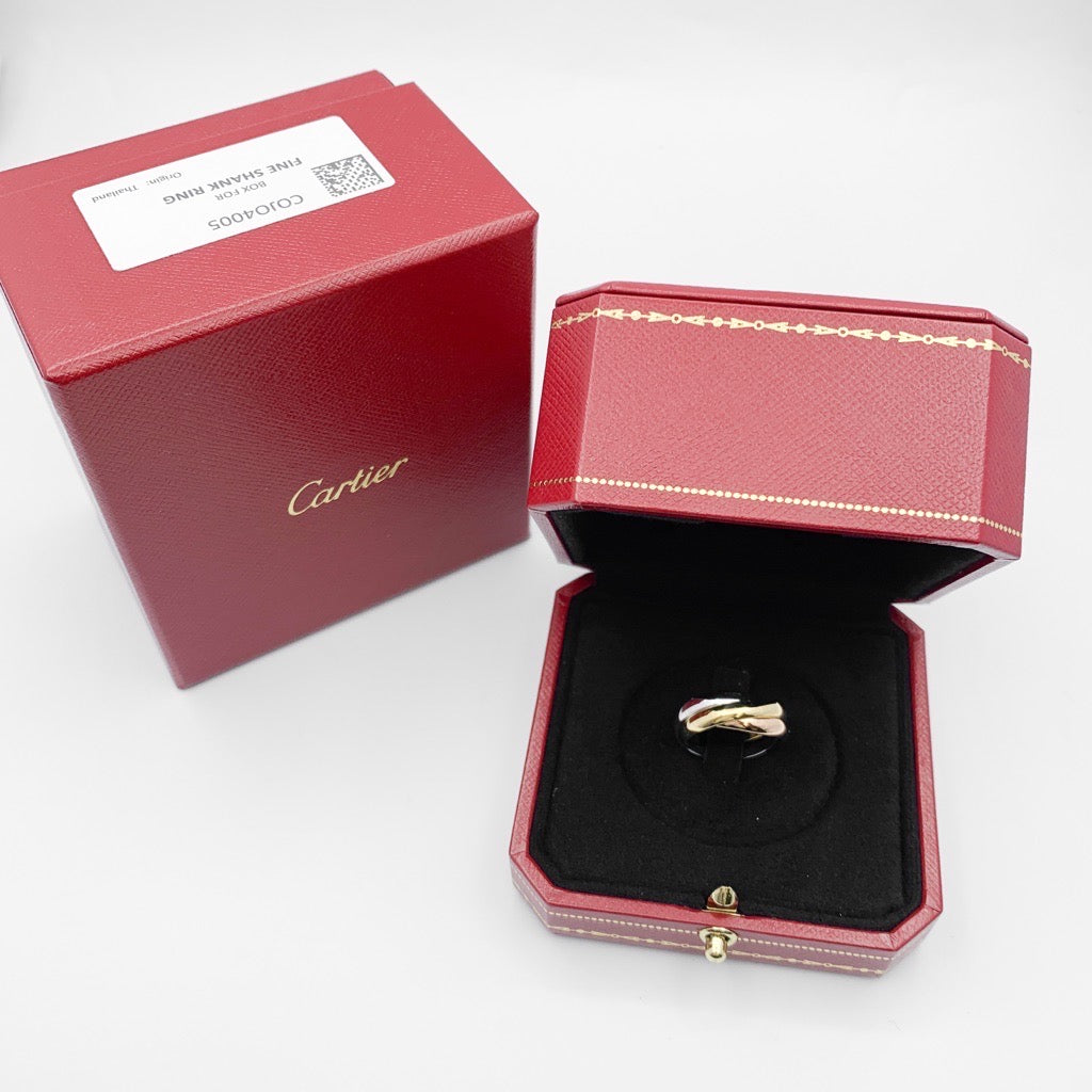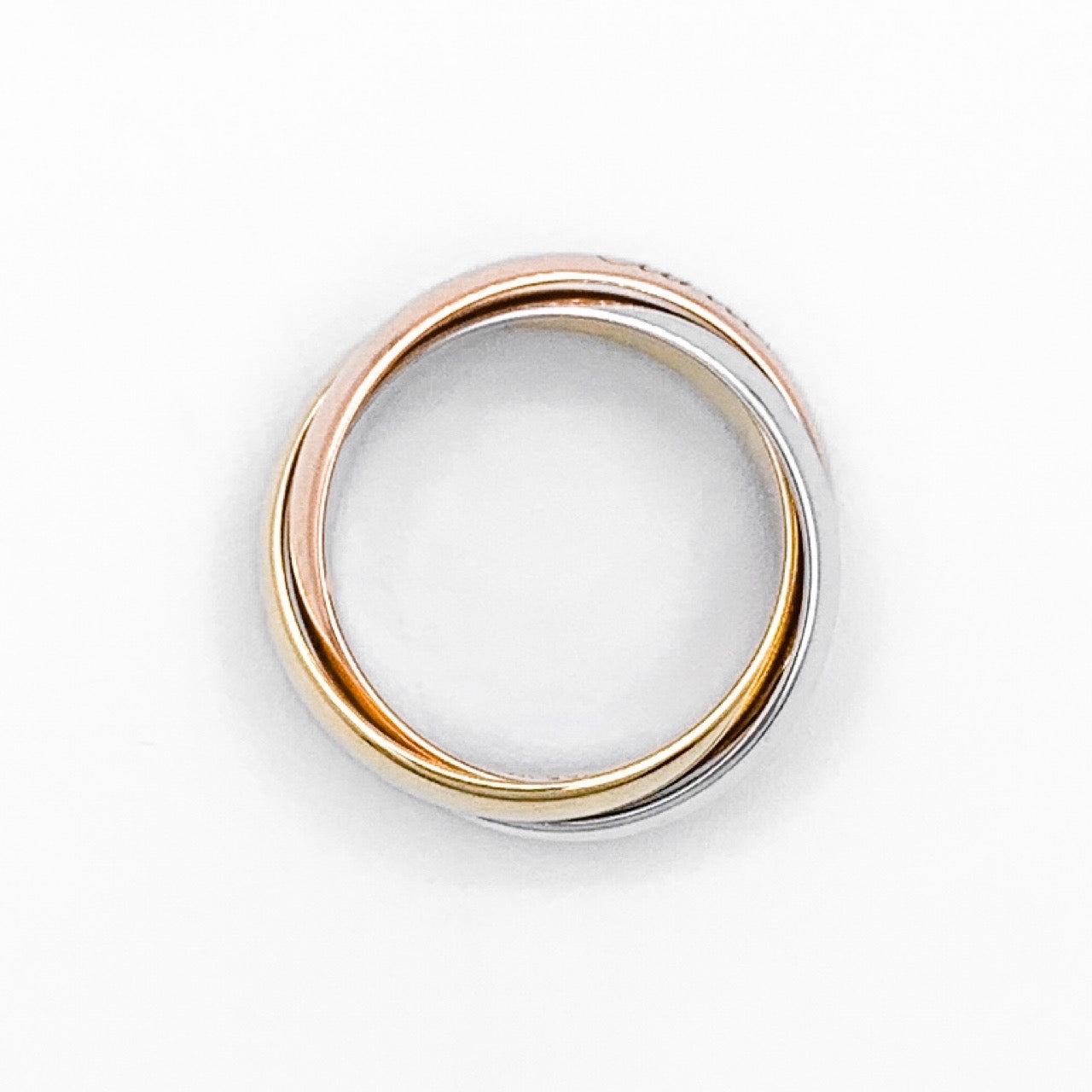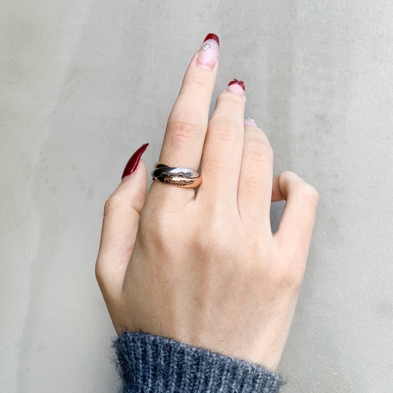 永遠のバランスを纏う、「トリニティリング」 3つのゴールドが柔らかく重なり合うトリニティリングは、カルティエを象徴するタイムレスな名作。 イエロー・ホワイト・ピンク、それぞれの色味が調和しながらも個性を放ち、手元に奥行きのある美しさを添えてくれます。 指を動かすたび、リング同士がふわりと触れ合い、まるで“自分らしさ”が揺らぎなく重なっていくような感覚。 シンプルでありながら、他にはない存在感を生み出すデザインは、年齢やスタイルを問わず馴染むのも魅力です。 さらに、外装仕上げ済みで安心してご愛用いただけます。