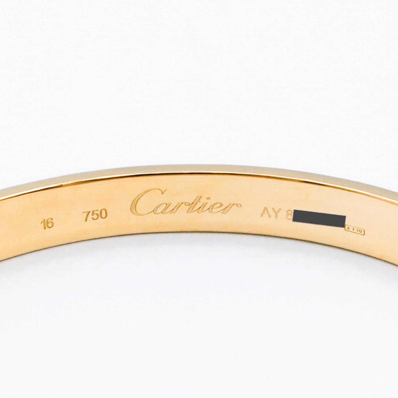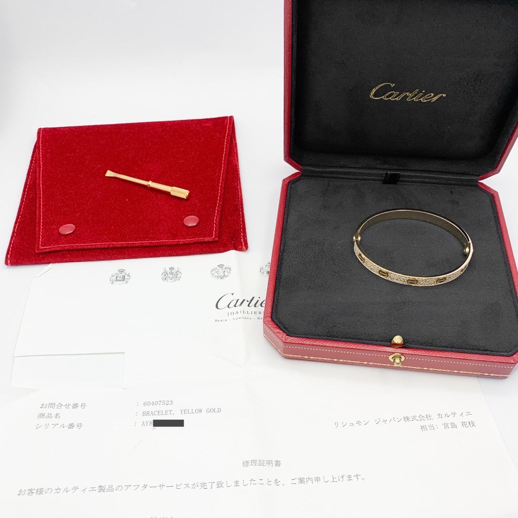 1969年にデビューしたカルティエの代表的なブレスレット《ラブブレス》 モチーフであるビスを惹き立てながら全面に並ぶダイヤモンドが、オケージョンからカジュアルスタイルまで、シーンを選ばず腕元を華やかに演出。 ペアアクセサリーとしても人気のアイテム。 カルティエ修理証明書付き&外装新品仕上げ済みで安心してご愛用いただけます。