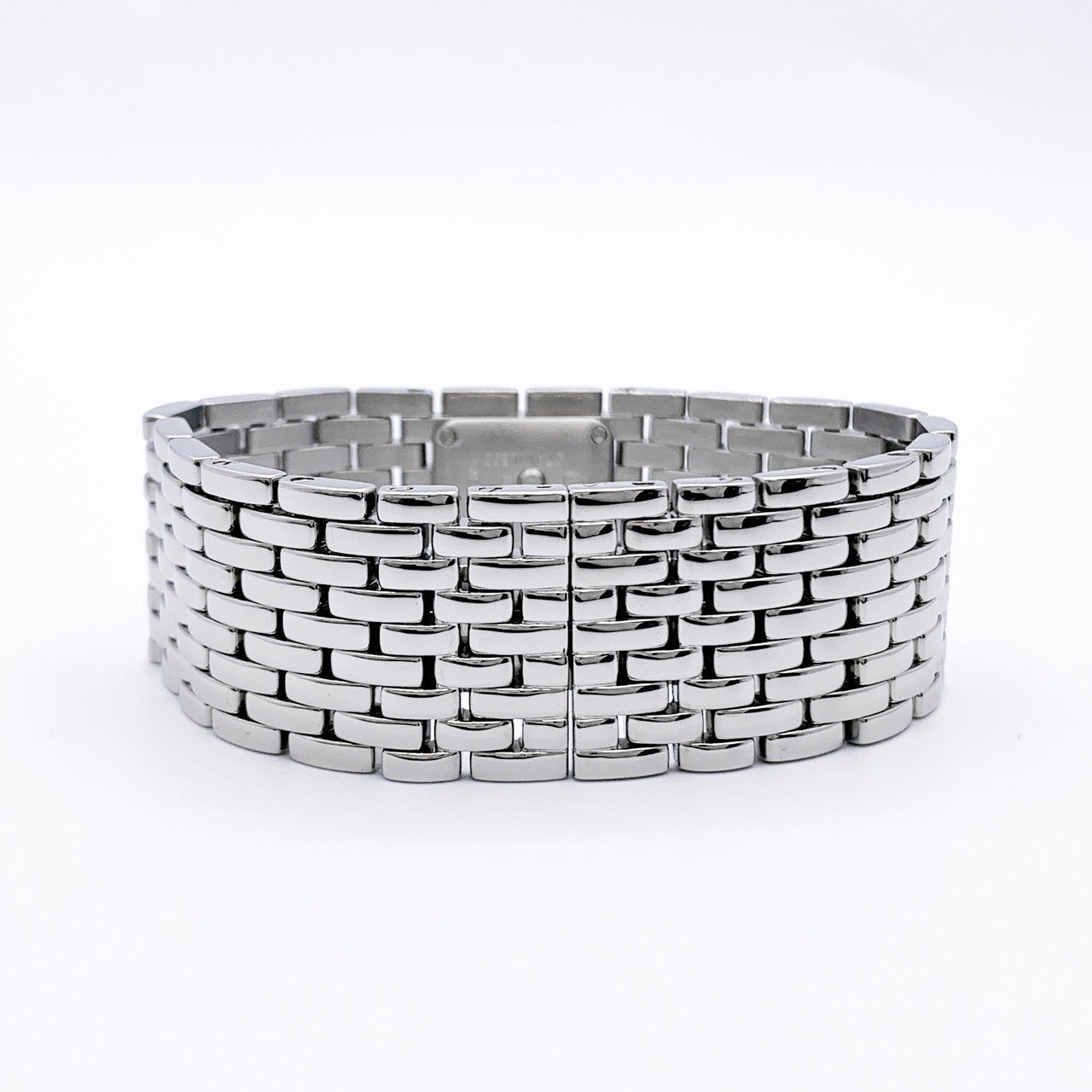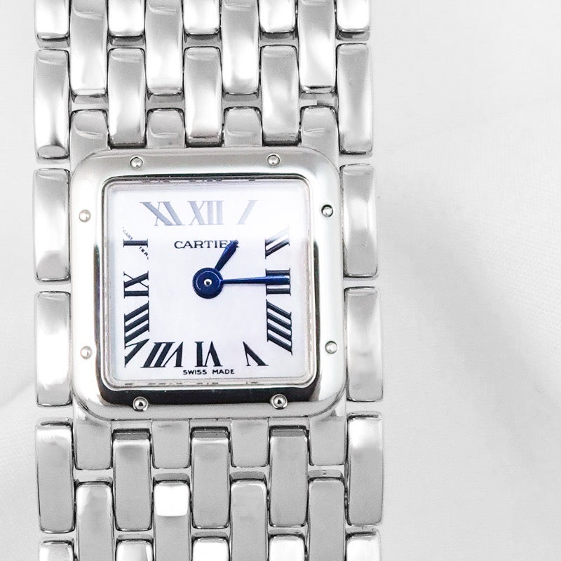 まるでジュエリーのように手元を飾る、しなやかなリュバン(=リボン)ブレスレット。 細やかなコマが織りなす柔らかなラインは、光を受けて繊細に揺れ、 “時計というより、もはやアクセサリー”と感じるほどの華やかさを放ちます。 決して大ぶりではないのに、存在感はしっかり。 手を動かすたびにきらりと光り、上品で女性らしい雰囲気を自然に引き出してくれる一本です。 パンテールらしいエレガンスをそのままに、よりフェミニンで軽やかな仕上がり。 普段使いはもちろん、特別なシーンにもそっと寄り添う、 “つけた瞬間に気分が上がる”ご褒美ウォッチです。 さらに当店職人、一級時計修理技能士による電池交換、点検、外装仕上済みで安心してご愛用いただけます。