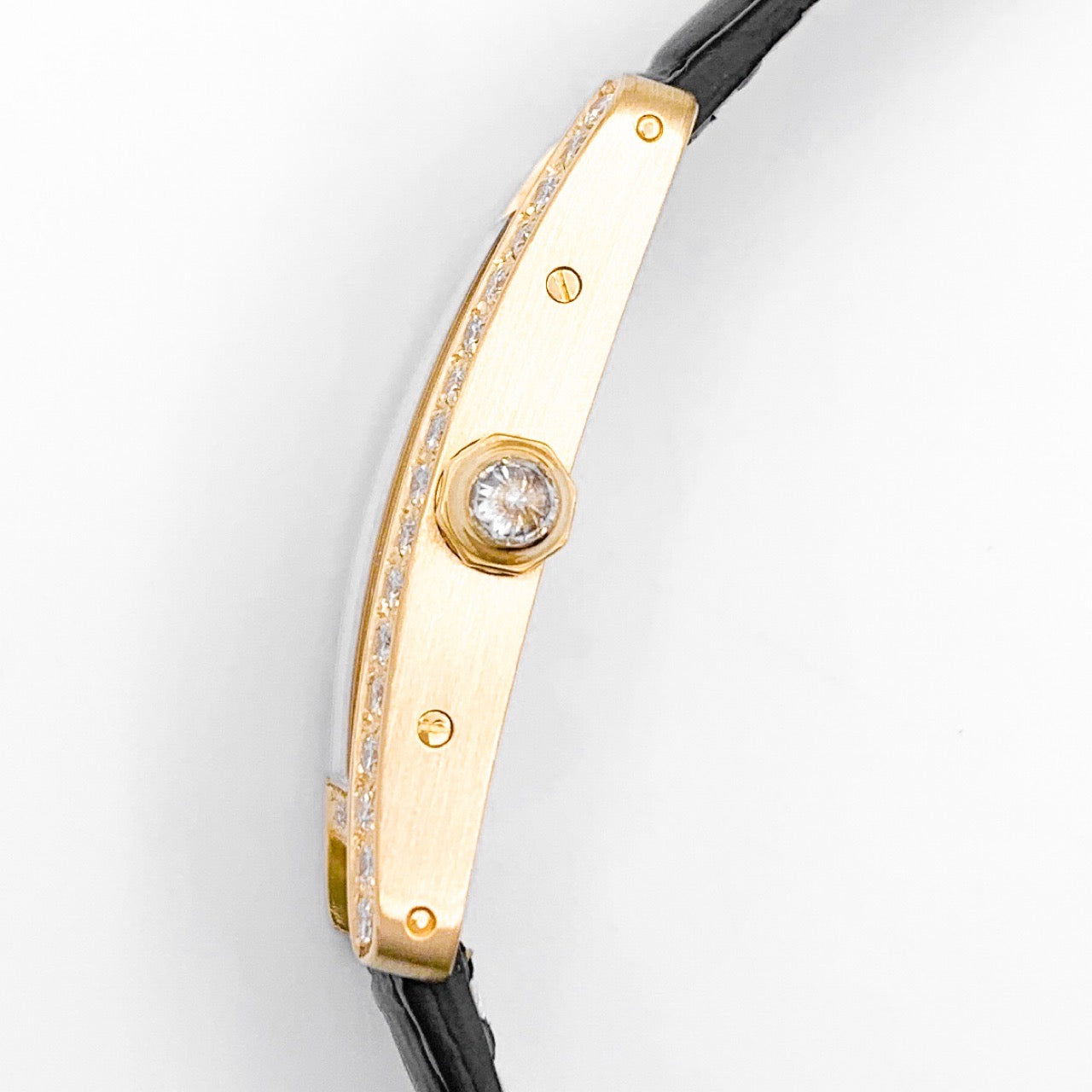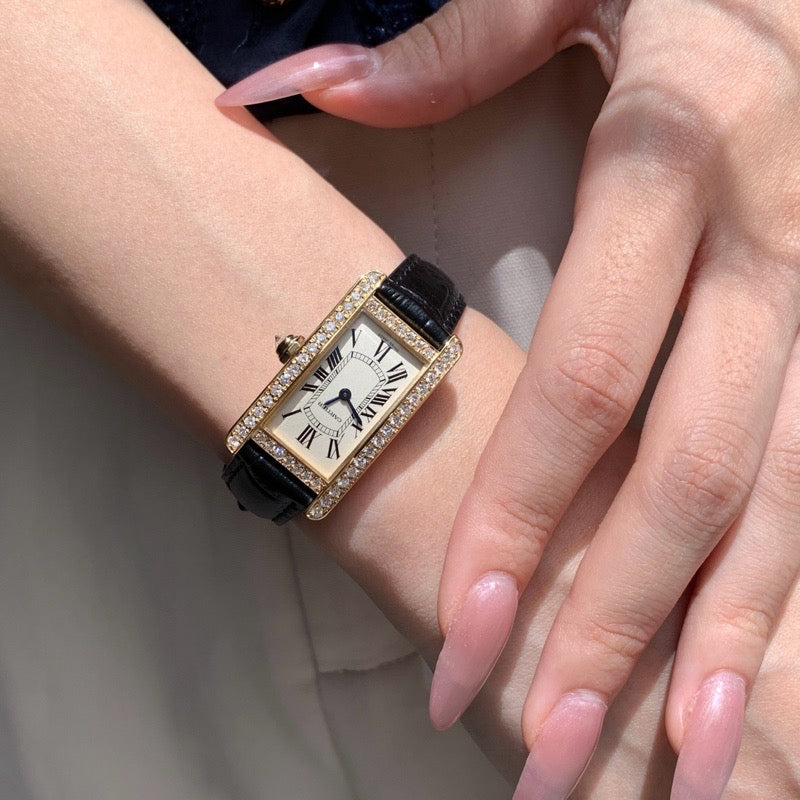 タンクシリーズの中で一際シャープでスタイリッシュな印象を与える《タンクアメリカン》 ベゼルに施されたダイヤモンドが腕元をエレガントに昇華。2019年2月のカルティエ保証書付き&当店職人の一級時計修理技能士による電池交換と点検、外装仕上済みで安心してご愛用いただけます。