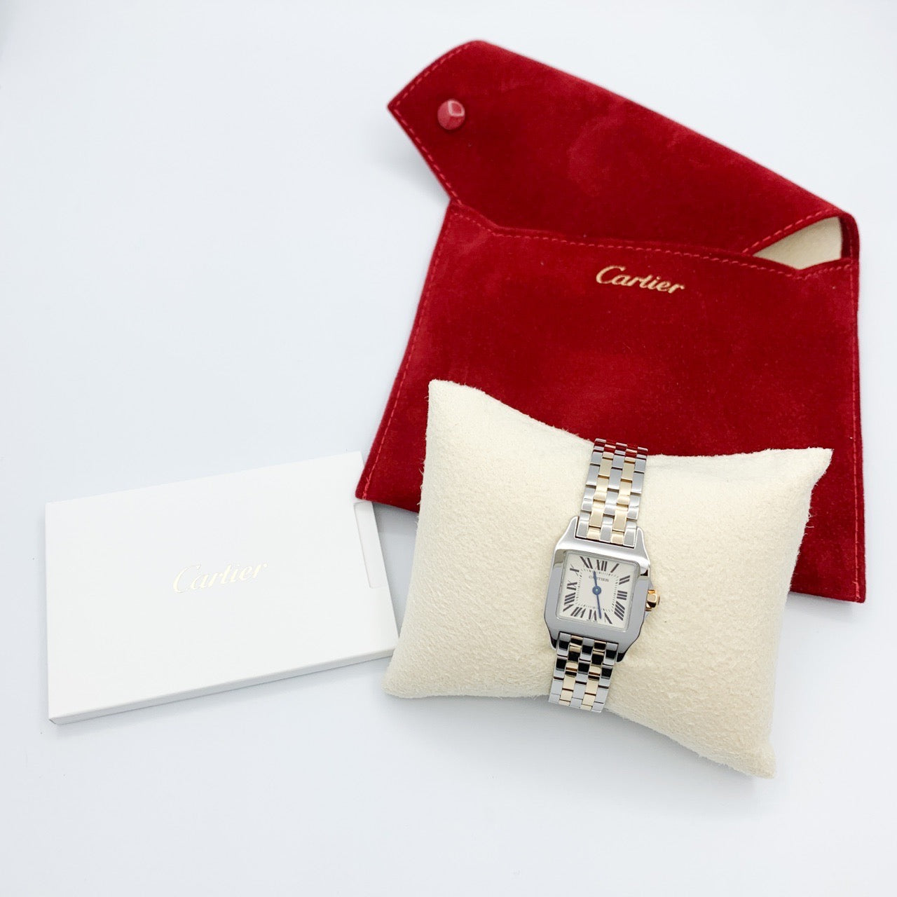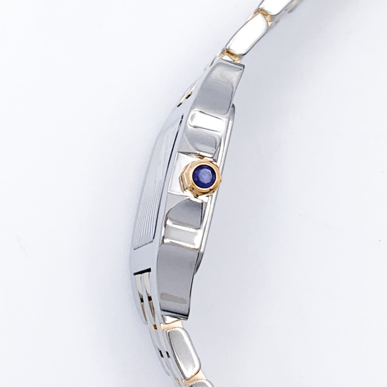 サントスの女性用として誕生した《サントスドゥモワゼル》サントスのシャープさとパンテールの柔らかな雰囲気を合わせ持ち、サントス100周年の際にデザインされたモデル。コンビカラーが腕元に華やぎを添え、スクエアのフェイスが知的な印象に。当店、一級時計修理技能士による電池交換、外装仕上済みで安心してご愛用いただけます。