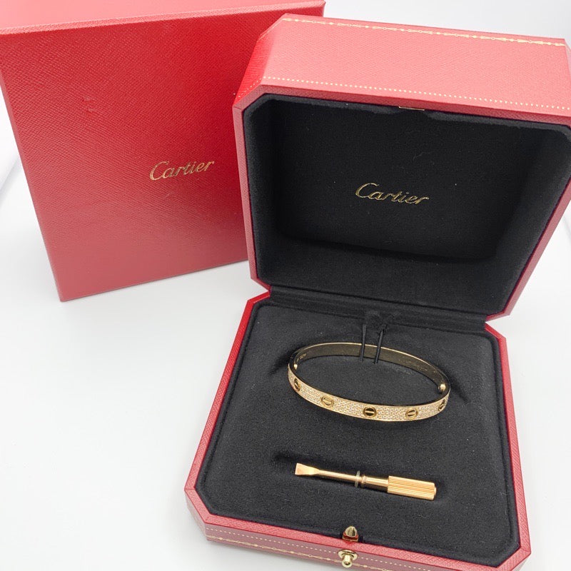 1969年にデビューしたカルティエの代表的なブレスレット《ラブブレス》 モチーフであるビスを惹き立てながら全面に並ぶダイヤモンドが、オケージョンからカジュアルスタイルまで、シーンを選ばず腕元を華やかに演出。 脱着がスムーズな新型タイプで、ペアアクセサリーとしても人気のアイテム。外装仕上げ済みで安心してご愛用いただけます。