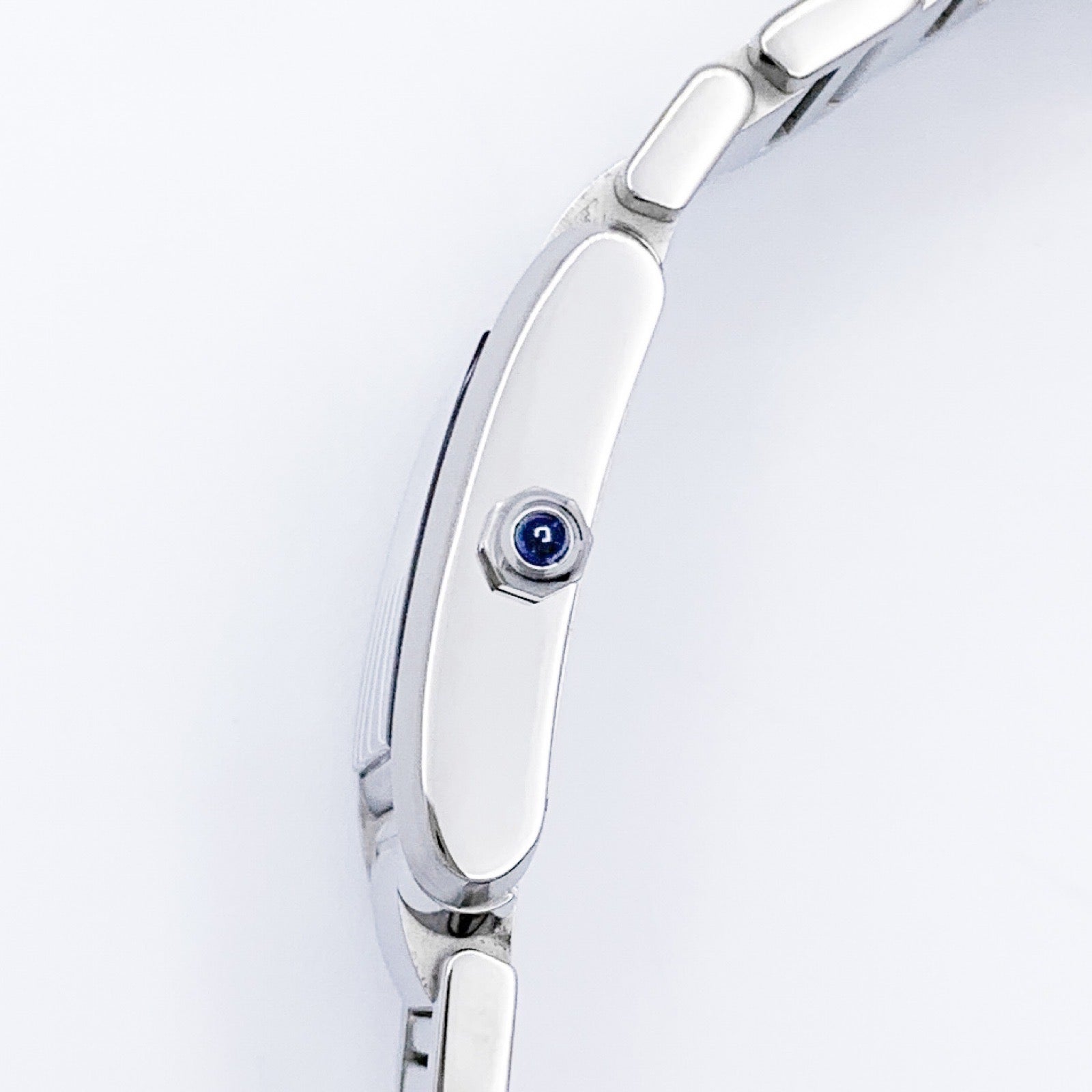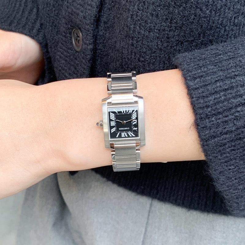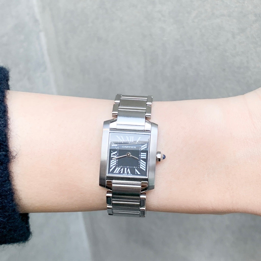 CARTIERシリーズの中でも特に人気が高く、ファーストカルティエとしても定番の《タンクフランセーズ》モダンなブレスレットの様なデザインは、どんなファッションでも合わせやすく、永く愛せる腕時計。
