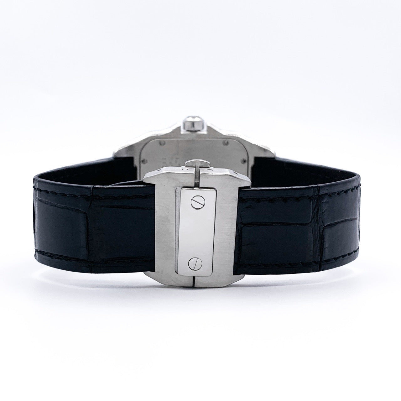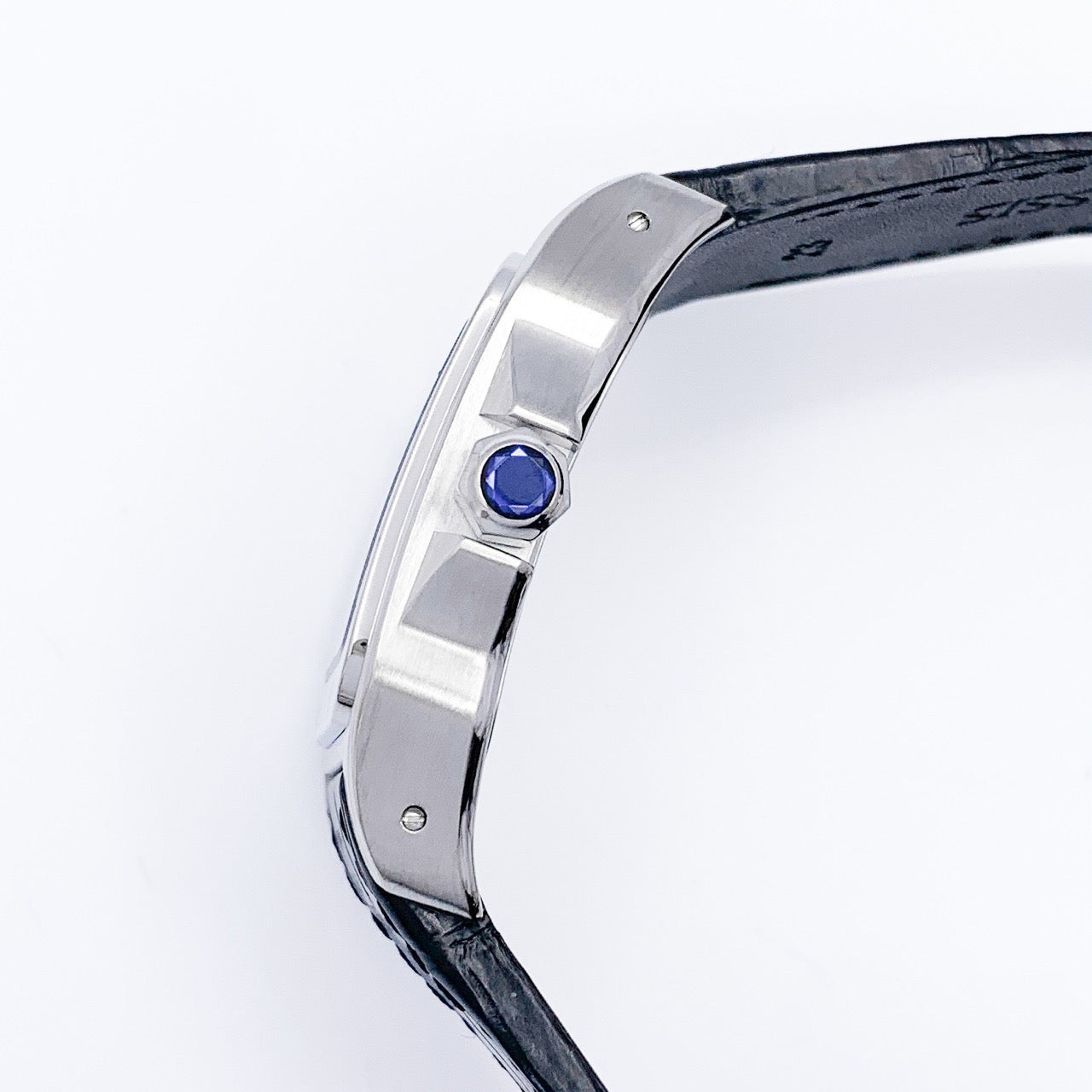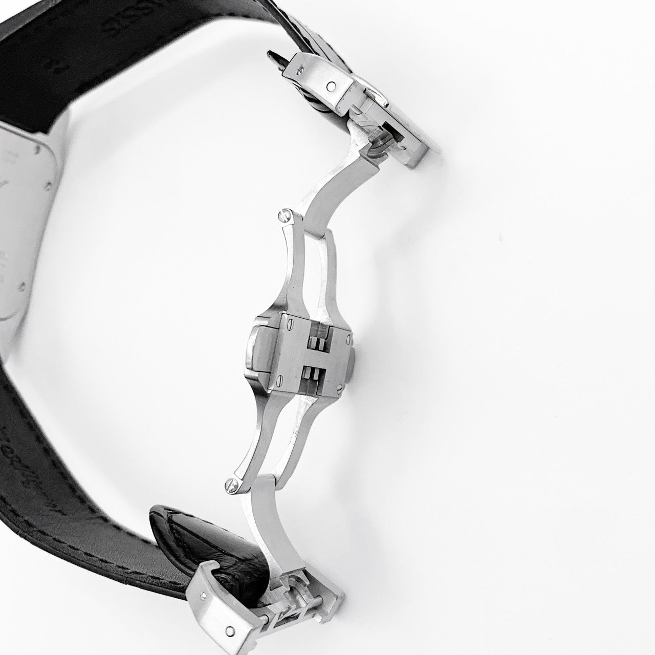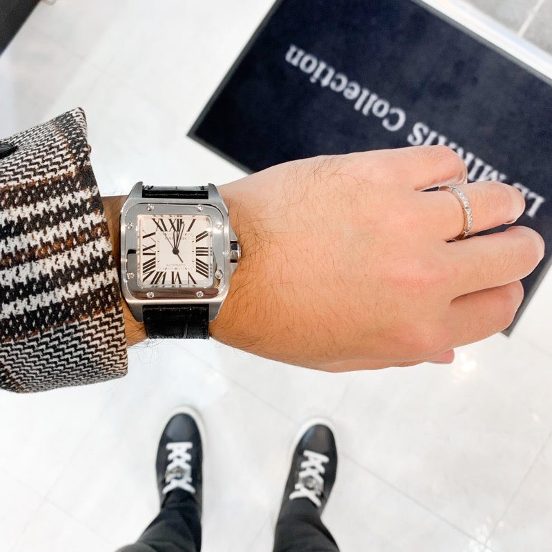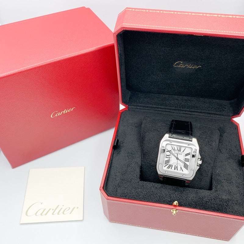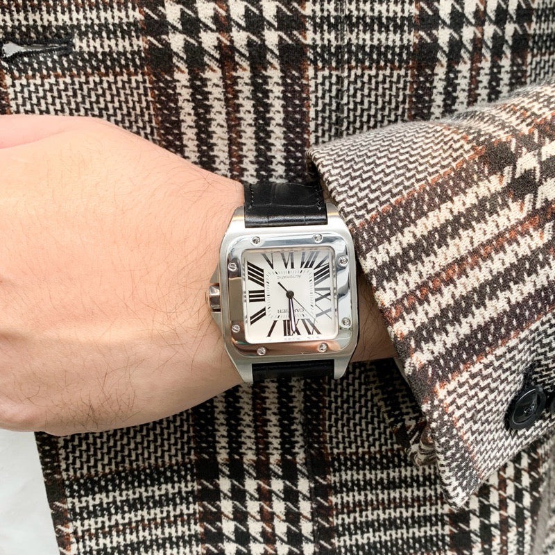 サントスの登場100年を記念して発売されたサントス100。 これまでのサントス・コレクションに見られた繊細さとは裏腹に、大きく迫力のあるボディで男女ともに支持の高い逸品。 当店職人、一級時計修理技能士による点検、外装仕上済みで安心してご愛用いただけます。
